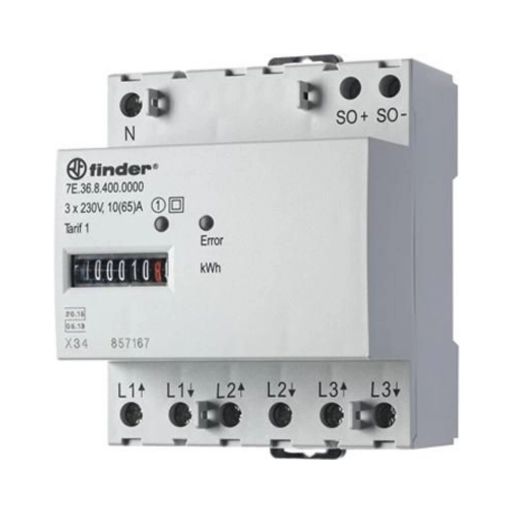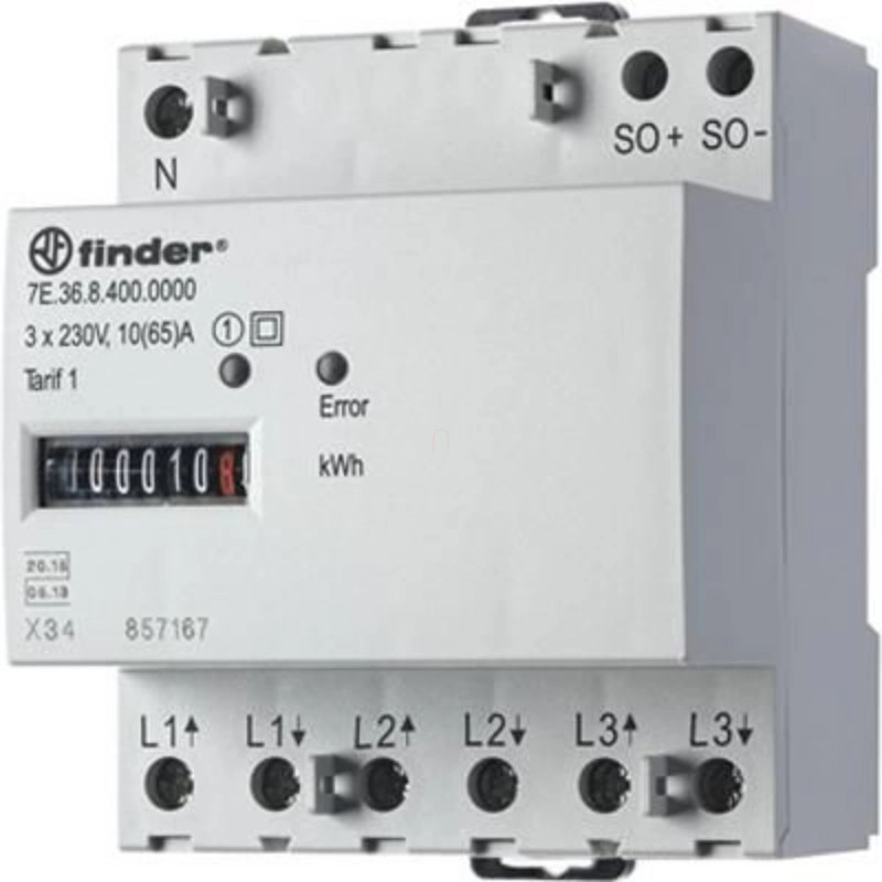 Fogyasztásmérő direkt 3F 65A mechanikus, MID hitelesített, DIN sínre,7E.36.8.400.0010 Finder
