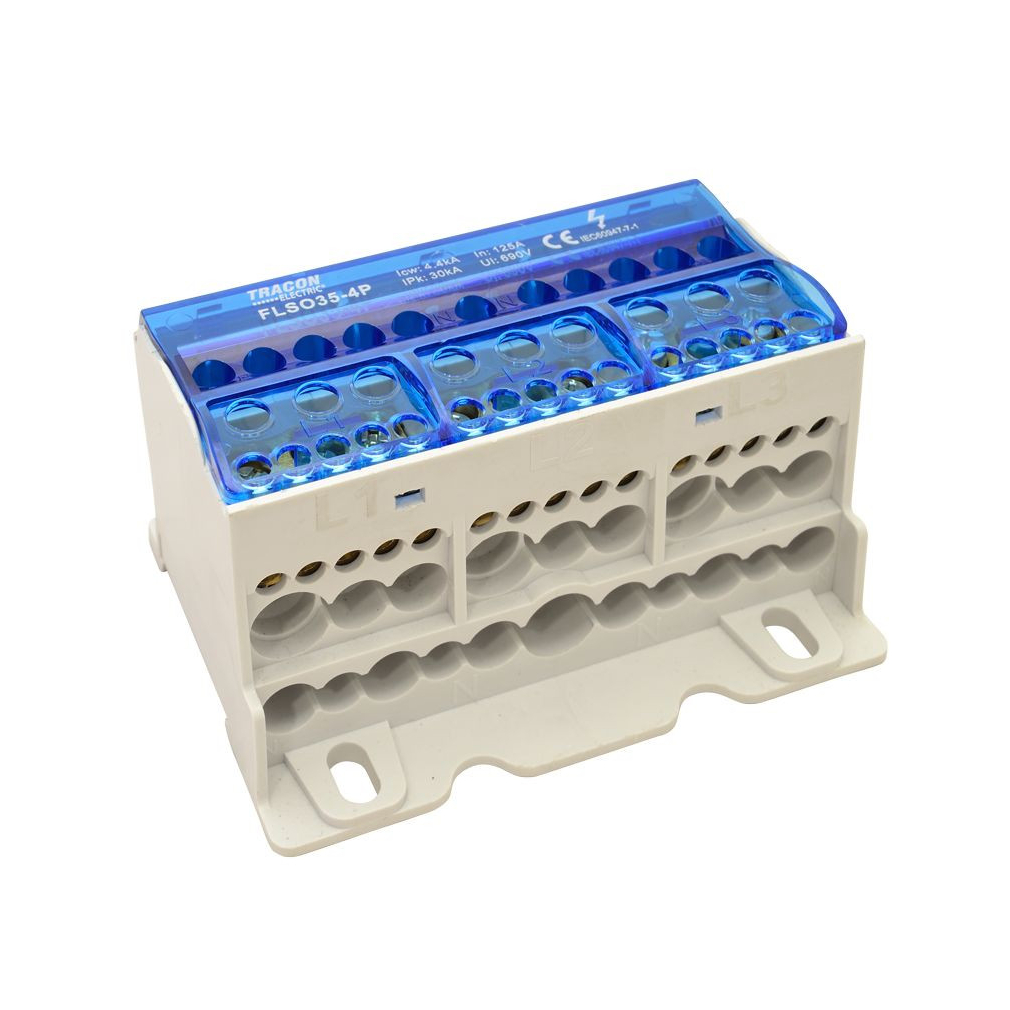 Fővezeték sorkapocs nyitható fedéllel 4×35(25)mm2 / 3×5×10,3×2×25 / 4×16,6×25mm2 FLSO35-4P Tracon