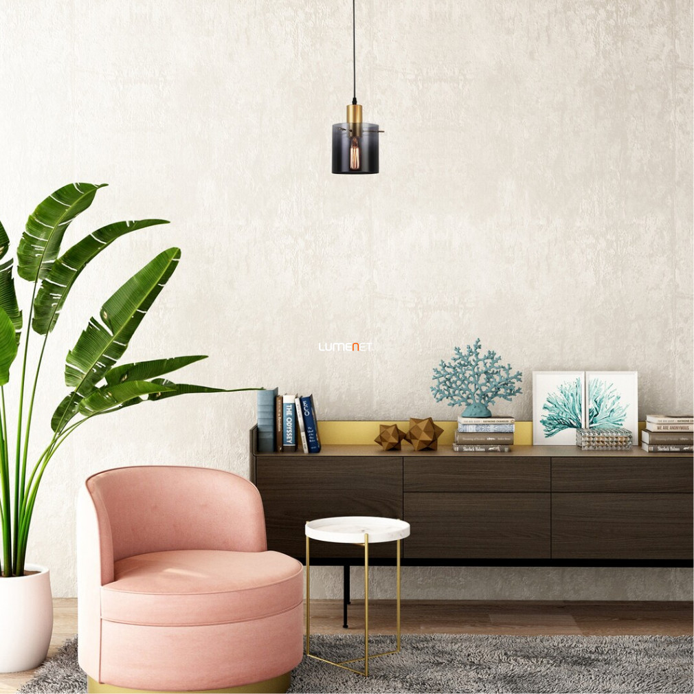 A Donati Rábalux 5222 függesztett lámpa egy modern kialakítású világítótest, amelyet 150 cm hosszúságú felfüggesztéssel terveztek. A lámpatest egy darab E27 foglalattal rendelkezik, így a fényforrás cserélhető, és nem tartalmazza a csomagolás a fényforrást. A lámpa fém és üveg anyaghasználattal, arany és füstszínű kivitelben készül, amely elegáns megjelenést biztosít bármely lakótérben. A termék IP20 védettséggel van ellátva, így beltéri használatra alkalmas. A lámpatest átmérője 150 mm, magassága 1500 mm, tömege 1,06 kg. Nem szabályozható, és a csomagolás méretei 22x21x22 cm. A gyártó a Rábalux.