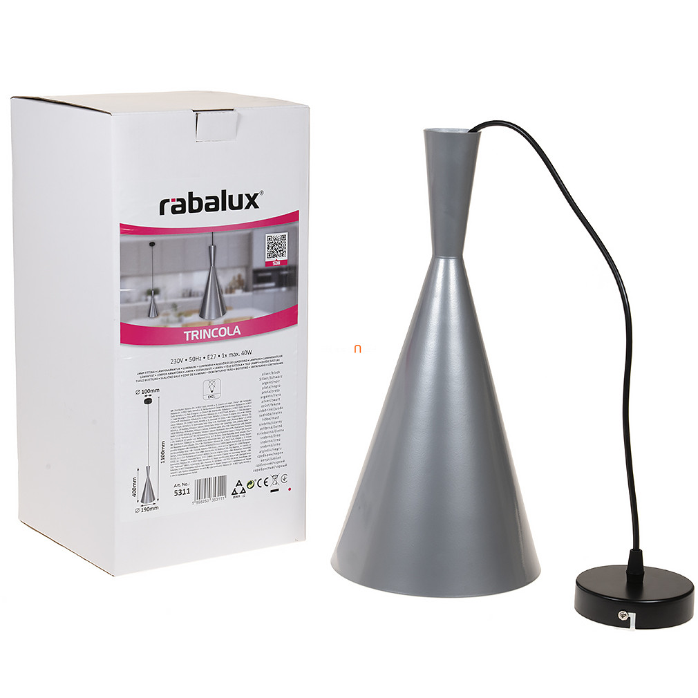 A Trincola Rábalux 5311 függesztett lámpa modern stílusban készült, 19 cm átmérővel és 110 cm magassággal. A lámpatest fekete és ezüst színű, fém anyagból készült, mely tartósságot és elegáns megjelenést biztosít. Az E27-es foglalat egy darab cserélhető fényforrás befogadására alkalmas, amely nem tartozék. A lámpa nem szabályozható, IP20 védettséggel rendelkezik, így beltéri használatra ajánlott. A termék tömege 0,5 kg, csomagolási méretei 20x20x41 cm. A Trincola Rábalux 5311 ideális megoldás lehet lakásvilágítási projektekhez, ahol a modern dizájn és a funkcionalitás kiemelt szempont.