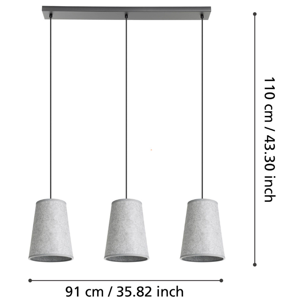 Az Alsager Eglo 43985 függesztett lámpa három darab E27 foglalattal rendelkezik, amely lehetővé teszi a fényforrások egyszerű cseréjét és a világítás testreszabását. A lámpatest acélból és textilből készült, fekete és szürke színkombinációban, így modern megjelenést biztosít bármely lakótérben. A termék méretei: hossza 910 mm, szélessége 210 mm, magassága 1100 mm, tömege 1,97 kg. A lámpatest IP20 védettséggel rendelkezik, így beltéri használatra alkalmas. A csomagolás mérete 78x26x23 cm. A termék nem tartalmaz fényforrást, így a megfelelő E27-es izzók külön választhatók hozzá. A gyártó az EGLO, a termék logisztikai kódja 43985.