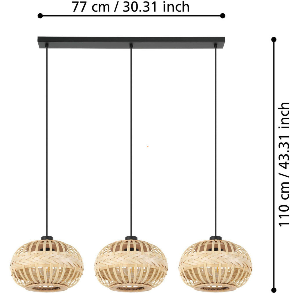 Az Amsfield 1 Eglo 43863 függesztett lámpa három E27 foglalattal rendelkezik, amelyek lehetővé teszik cserélhető fényforrások alkalmazását különböző teljesítmény, fényáram és színhőmérséklet igények szerint. A lámpatest acél és fa anyagok kombinációjából készült, fekete színben, modern, letisztult megjelenéssel. A termék méretei: 960 mm hosszúság, 260 mm szélesség és 1100 mm magasság, így ideális nagyobb belső terek megvilágítására. A lámpa IP20 védettséggel rendelkezik, ezért beltéri használatra ajánlott. A csomag nem tartalmaz fényforrást, így a fényerő és színhőmérséklet szabadon választható. A gyártó az EGLO, a termék logisztikai kódja 43863.
