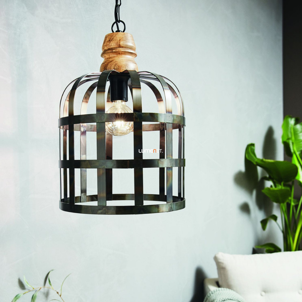 Az Oldcastle Eglo 49785 függesztett lámpa 31,5 cm átmérőjű, elegáns fekete-arany színkombinációval és vintage stílussal készül. A lámpatest acélból és fából készült, amely tartósságot és különleges megjelenést biztosít. Egy darab E27-es foglalattal rendelkezik, a fényforrás cserélhető, a lámpa nem tartalmazza a fényforrást. A termék 110 cm magasságú, IP20 védettségi besorolású, így kizárólag beltéri használatra alkalmas. A lámpa nem szabályozható, logisztikai kódja 49785, tömege 3,79 kg. A csomagolás mérete 33x33x34 cm, a gyártó az EGLO.