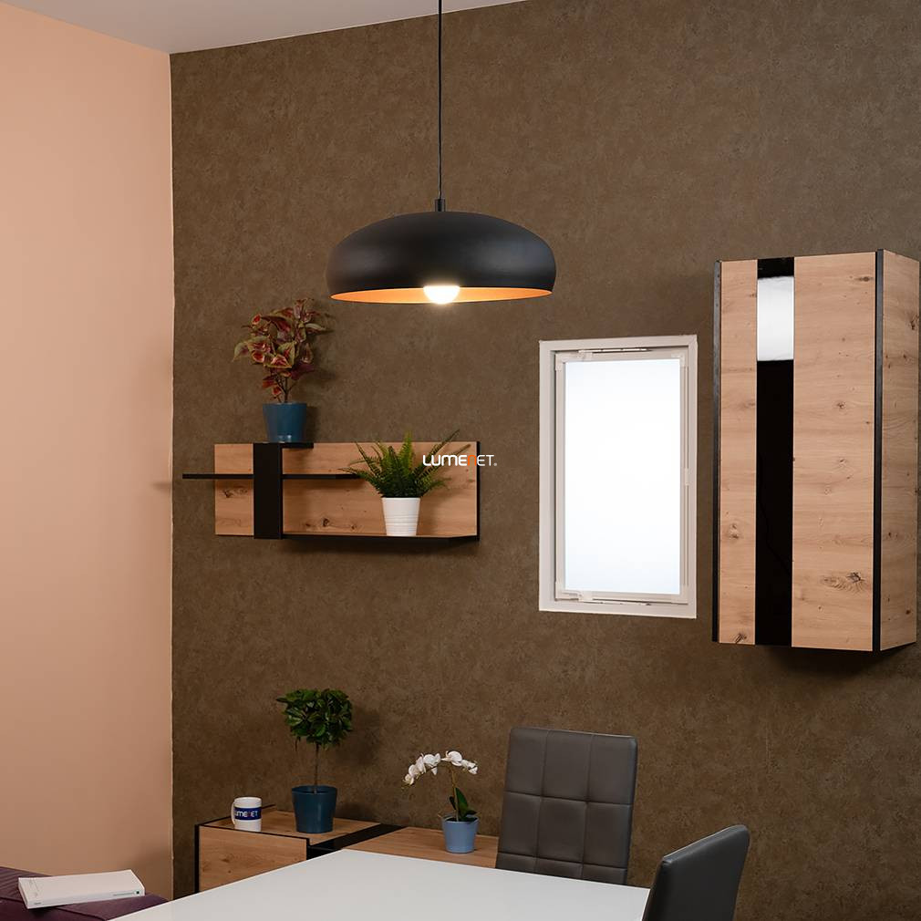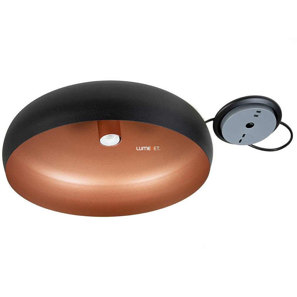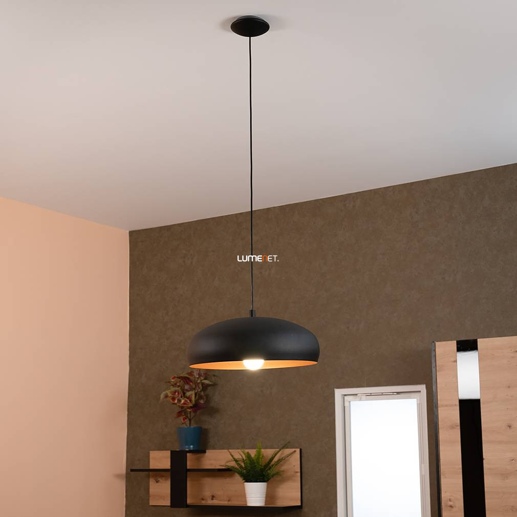 A Függesztett lámpa, 40 cm - Mogano 1 Eglo 94605 egy vintage stílusú, acélból készült lakásvilágítási megoldás, amelyet fekete és vörösréz színkombináció jellemez. A lámpatest átmérője 400 mm, magassága 1100 mm, súlya pedig 2,23 kg. Egy darab E27-es foglalattal rendelkezik, a fényforrás nem tartozék, így külön választható a kívánt fényáram, színhőmérséklet és teljesítmény. A lámpa nem szabályozható, IP20-as védettséget biztosít beltéri használatra. A termék csomagolásának méretei: 19 cm szélesség, 41 cm hosszúság és 41 cm magasság. A gyártó az EGLO.