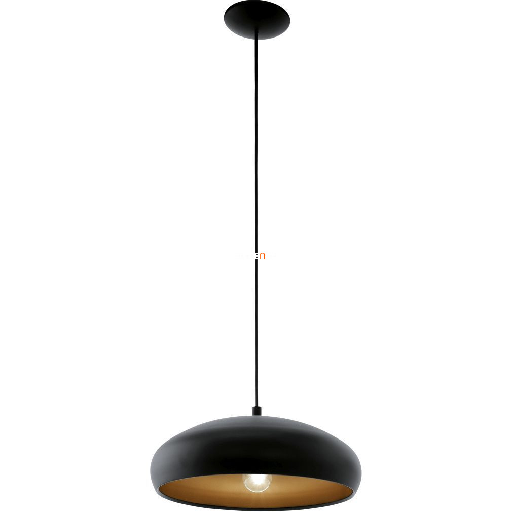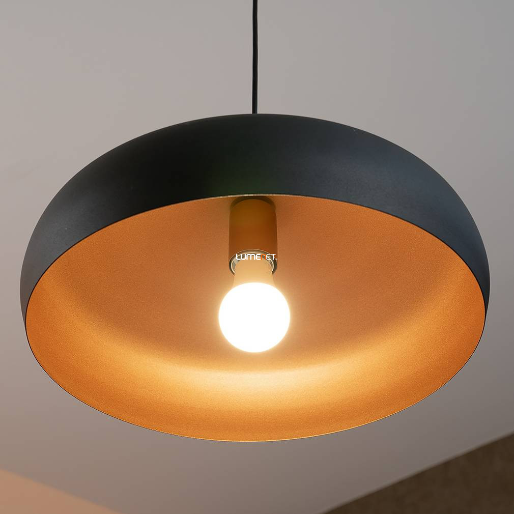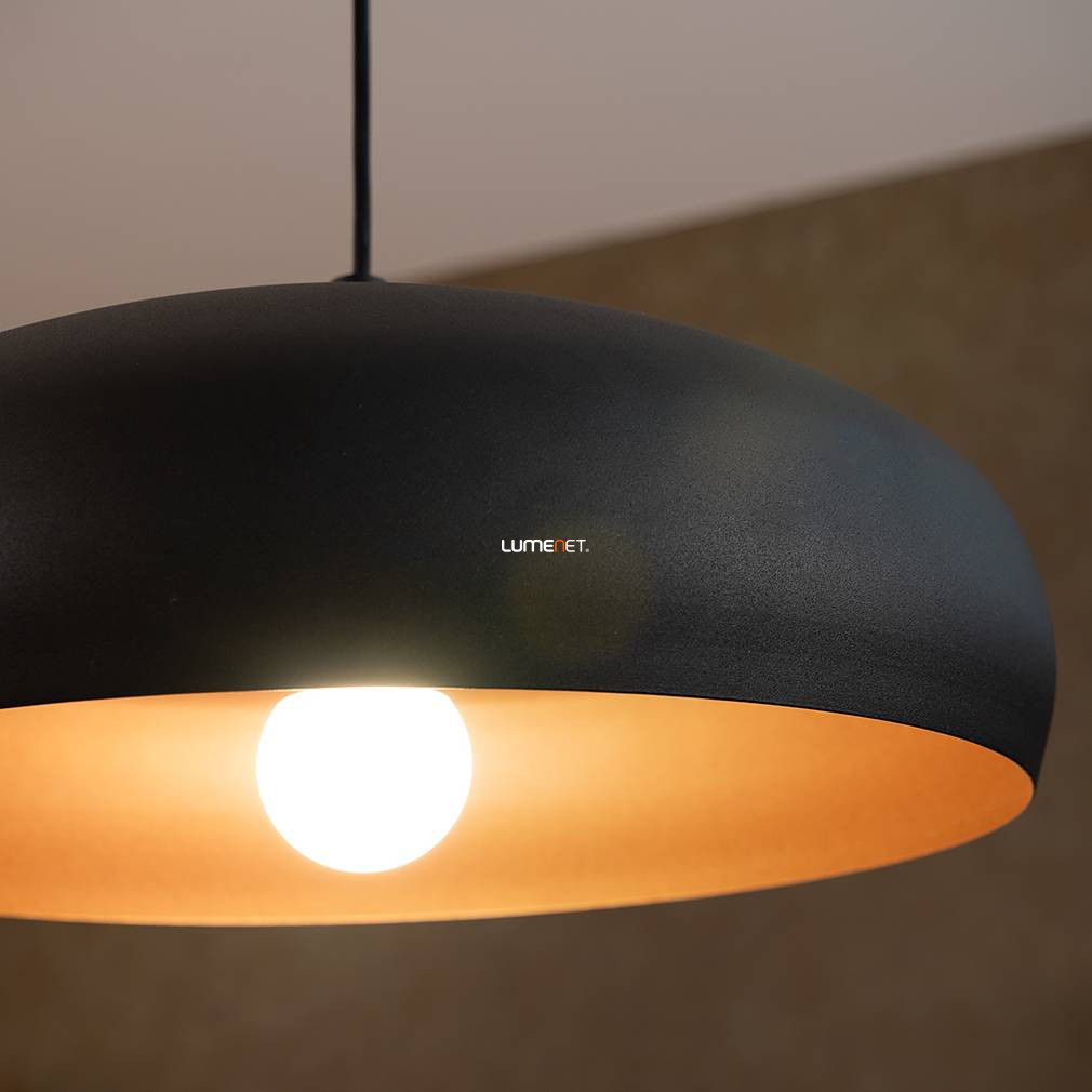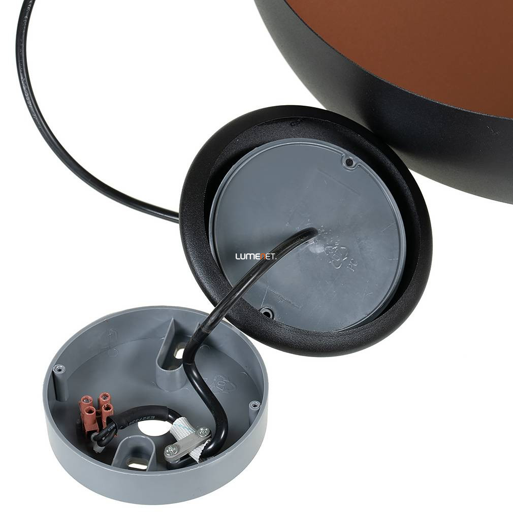 A Függesztett lámpa, 40 cm - Mogano 1 Eglo 94605 egy vintage stílusú, acélból készült lakásvilágítási megoldás, amelyet fekete és vörösréz színkombináció jellemez. A lámpatest átmérője 400 mm, magassága 1100 mm, súlya pedig 2,23 kg. Egy darab E27-es foglalattal rendelkezik, a fényforrás nem tartozék, így külön választható a kívánt fényáram, színhőmérséklet és teljesítmény. A lámpa nem szabályozható, IP20-as védettséget biztosít beltéri használatra. A termék csomagolásának méretei: 19 cm szélesség, 41 cm hosszúság és 41 cm magasság. A gyártó az EGLO.