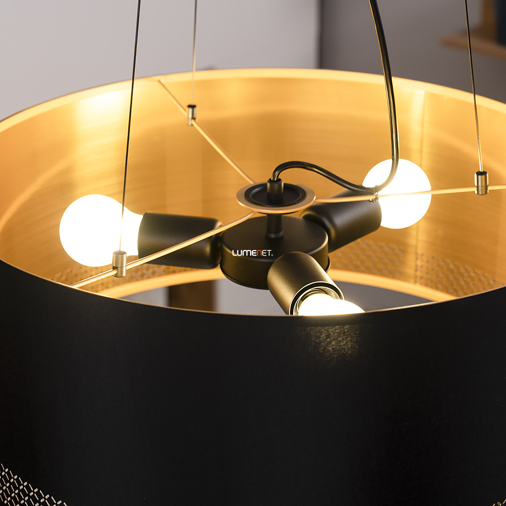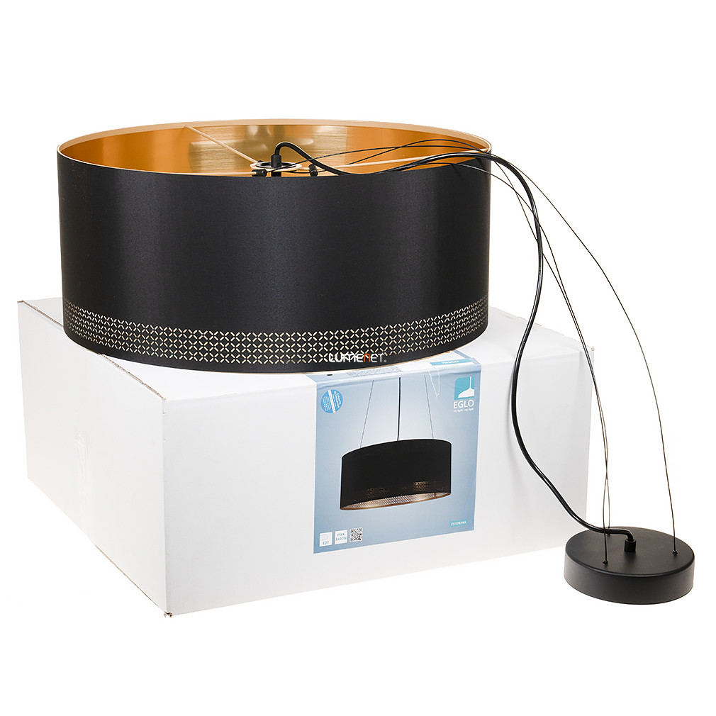 Az Esteperra Eglo 99274 függesztett lámpa modern stílusban készült, fekete textil burával és arany színű díszítő szegéllyel. A lámpatest három darab E27 foglalattal rendelkezik, amelyekbe cserélhető fényforrás helyezhető, így a fényáram, színhőmérséklet és teljesítmény is szabadon választható. A termék nem szabályozható, védettségi besorolása IP20. Az acél és textil anyaghasználat biztosítja a tartósságot és az esztétikus megjelenést. Átmérője 530 mm, maximális magassága 1100 mm, tömege 2,69 kg. A csomagolás mérete 54x54x24 cm. A lámpa nem tartalmazza a fényforrást, így az külön vásárolható meg. A gyártó az EGLO, a termék logisztikai kódja 99274.