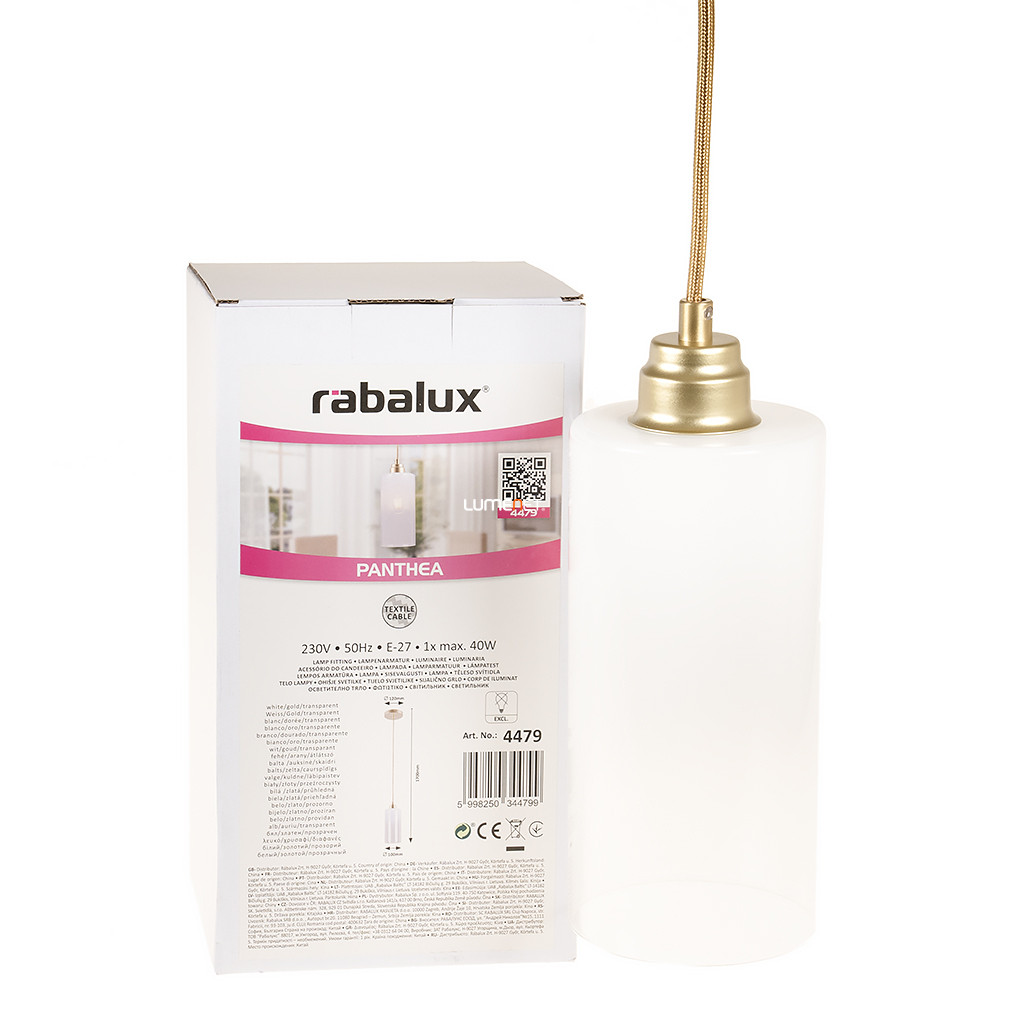 A Panthea Rábalux 4479 függesztett lámpa elegáns arany és fehér színkombinációban készül, prémium minőségű fémből és üvegből. A lámpatest egy darab E27 foglalattal rendelkezik, amely lehetővé teszi cserélhető fényforrás használatát, így a fényáram, a fényszín, a teljesítmény és a színhőmérséklet szabadon választható. A lámpa nem szabályozható, IP20 védettségi besorolással rendelkezik, amely beltéri használatra alkalmassá teszi. Az átmérője 100 mm, magassága 1700 mm, tömege 2,66 kg. A csomagolás méretei: 14 cm szélesség, 27 cm hosszúság, 15 cm magasság. A terméket a Rábalux gyártja, a logisztikai kódja 4479. A lámpa fényforrást nem tartalmaz.