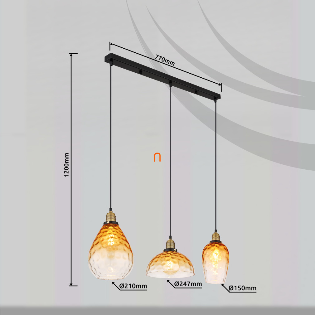A Salvy Globo 15786-3H függesztett lámpa borostyán színű üvegburákkal és matt fekete fém vázzal készül, modern lakásvilágítási megoldásként. A lámpatest három darab E27 foglalattal rendelkezik, amelyek cserélhető fényforrások használatát teszik lehetővé, így a fényáram, fényszín és színhőmérséklet szabadon választható. A lámpa 91 cm hosszú, 25 cm széles, magassága maximum 120 cm. Névleges feszültsége 230 V, védettségi szintje IP20, amely beltéri használatra teszi alkalmassá. A termék tömege 5,05 kg. A csomagolás méretei: 84 cm hosszú, 31 cm széles és 31 cm magas. A lámpatesthez fényforrás nem tartozik. A terméket a Globo gyártja, logisztikai kódja 15786-3H.