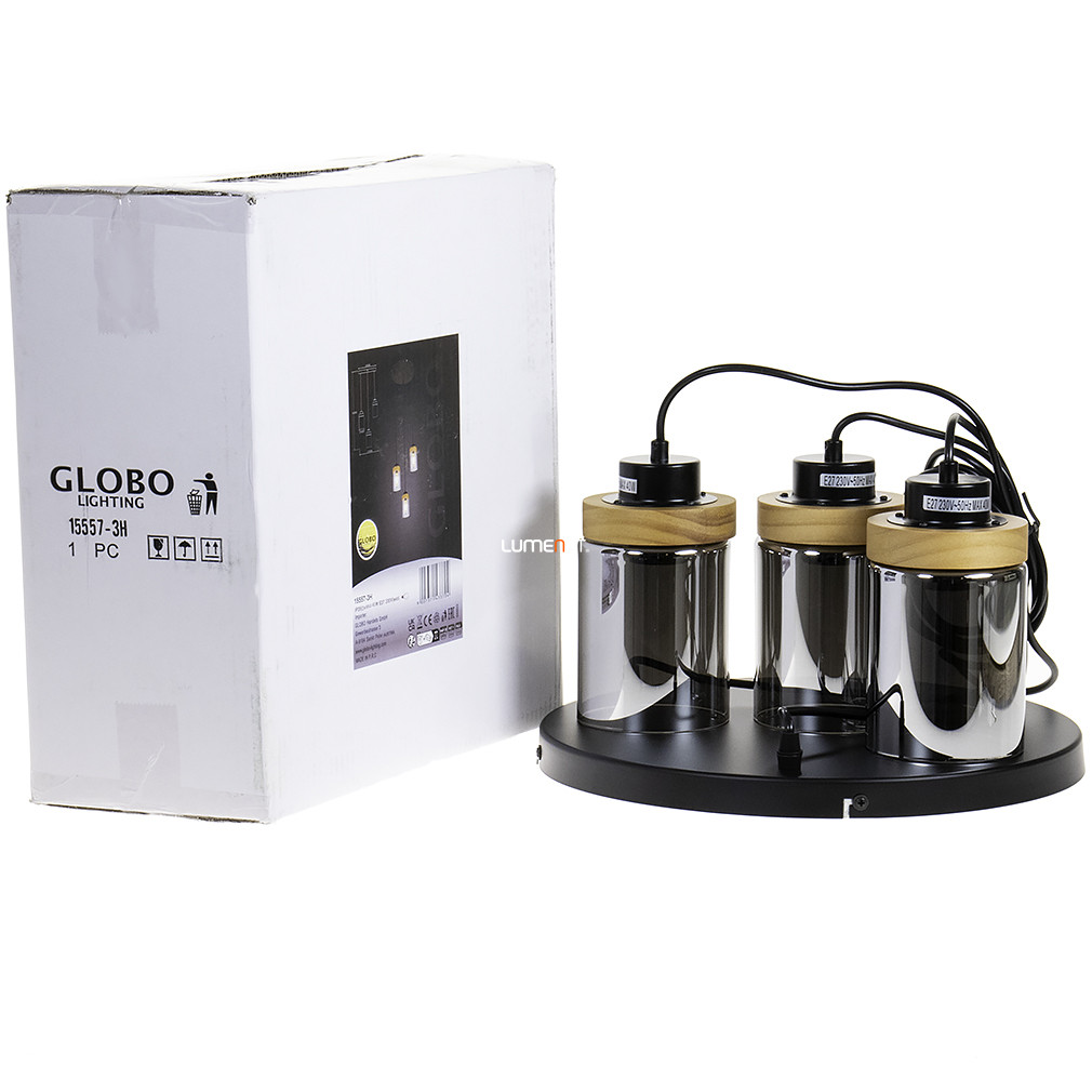 A Finca Globo 15557-3H függesztett lámpa három E27 foglalattal rendelkezik, így különböző cserélhető fényforrásokkal kompatibilis. A lámpatest kialakítása vintage stílusú, fő anyaga fém és üveg, színe fekete és barna kombinációban jelenik meg. A termék átmérője 390 mm, maximális magassága 1500 mm, tömege 4,2 kg. A lámpa IP20-as védettségi besorolással rendelkezik, így beltéri használatra alkalmas. A csomag nem tartalmaz fényforrást, a fényáram, fényszín és színhőmérséklet a behelyezett izzótól függ. A termék nem szabályozható, a gyártó Globo. A csomagolás méretei: 16 cm szélesség, 40 cm hosszúság, 40 cm magasság. A logisztikai kód: 15557-3H.