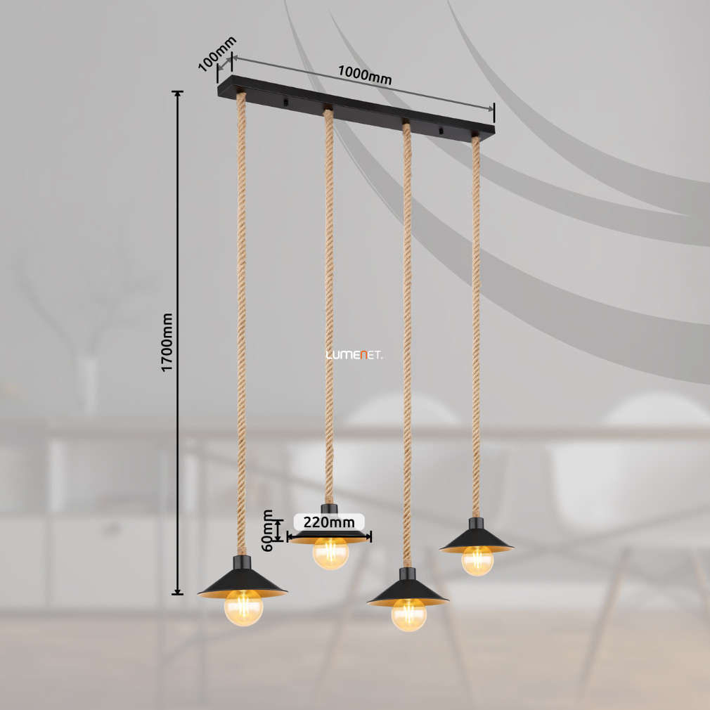 A Diana Globo 15690-4H függesztett lámpa négy E27-es foglalattal rendelkezik, így lehetőséget biztosít különböző típusú cserélhető fényforrások használatára. A lámpatest IP20 védettséggel készül, elsősorban beltéri használatra alkalmas. A vintage stílusú lámpa fém és kötél anyaghasználattal, fekete, arany és barna színekben jelenik meg, amely karakteres megjelenést kölcsönöz az enteriőrnek. A lámpa méretei 1125 mm hosszúság, 220 mm szélesség és 1700 mm magasság. A termék tömege 3,47 kg. A fényforrásokat a csomag nem tartalmazza, a fényáram, fényszín és színhőmérséklet a választott izzótól függ. A lámpa nem szabályozható, így fix fényerővel üzemeltethető. Gyártója a Globo.
