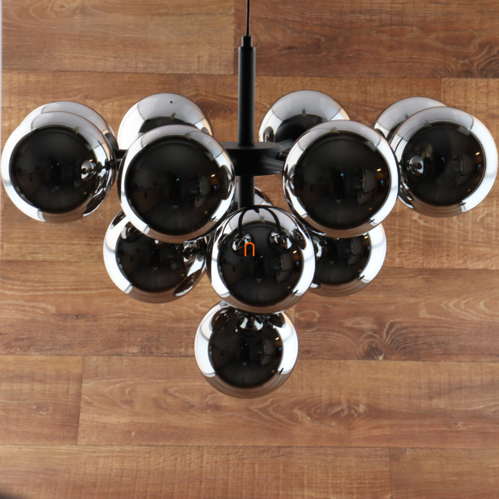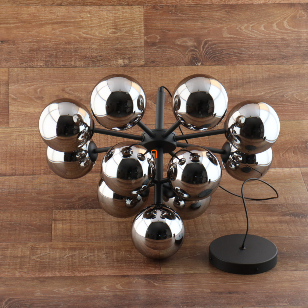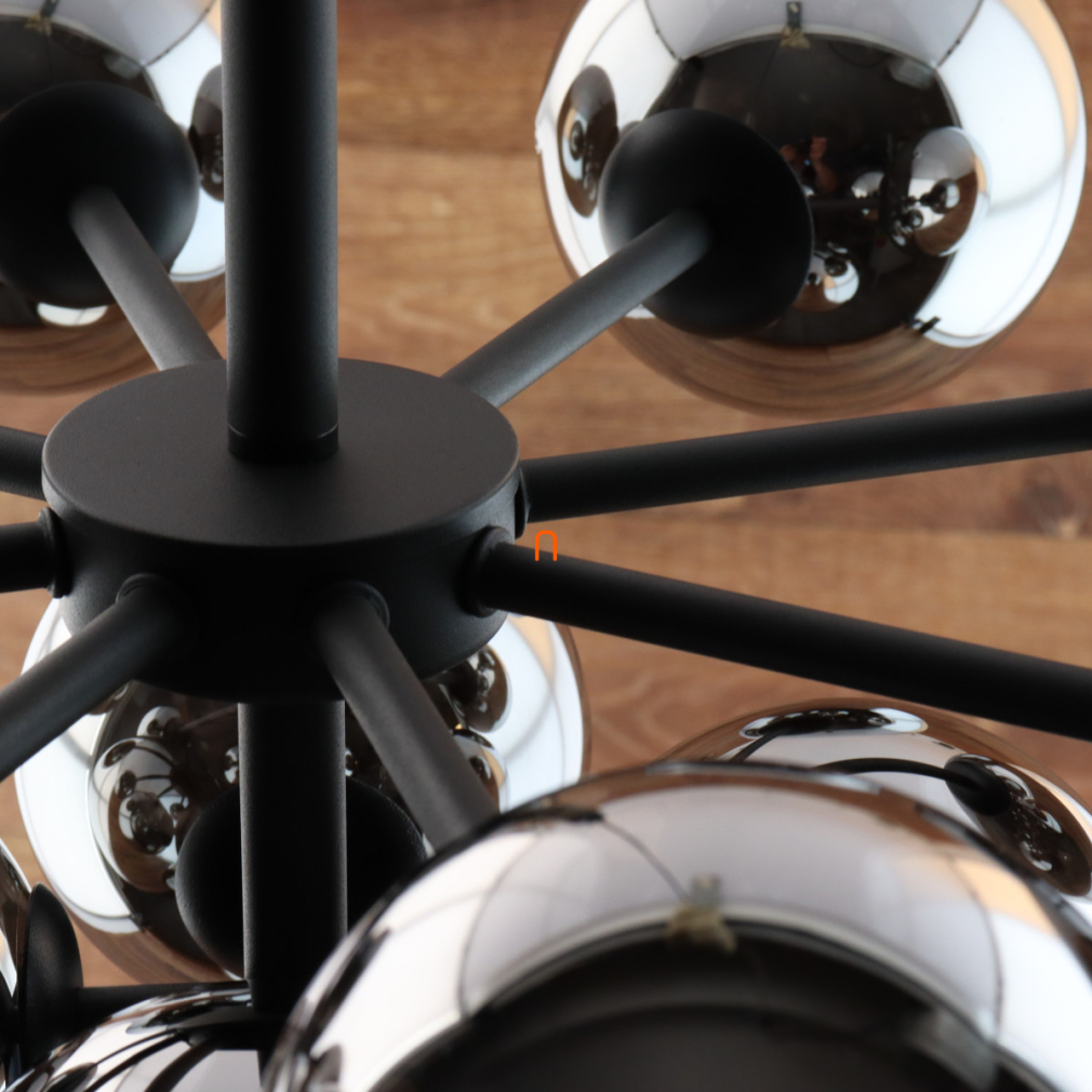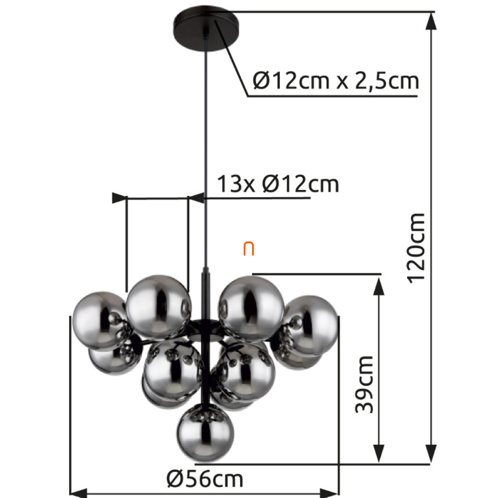 A Grappy Globo 56143-13 függesztett lámpa modern kialakítását füstszínű üveggömb búrák és matt fekete fém szerkezet jellemzi. A lámpatest összesen tizenhárom darab G9-es foglalattal rendelkezik, amelyekbe cserélhető fényforrások helyezhetők el. A termék 230 V névleges feszültséggel működik, IP20 védettségi besorolással rendelkezik, így beltéri használatra alkalmas. Az átmérője 560 mm, magassága 1200 mm. A lámpatest üvegből és fémből készült, a csomagolás méretei 58x58x35 cm, tömege 4,79 kg. A fényforrás nem tartozék, a színhőmérséklet és a fényáram a behelyezett izzótól függően változtatható.