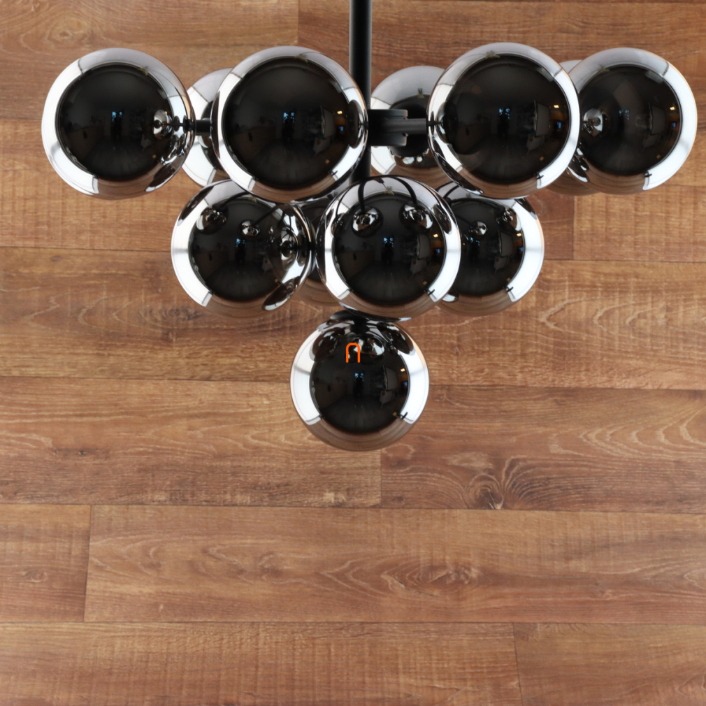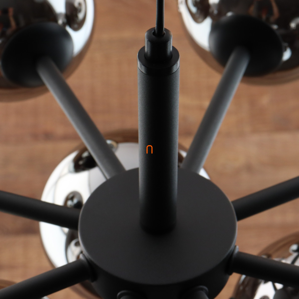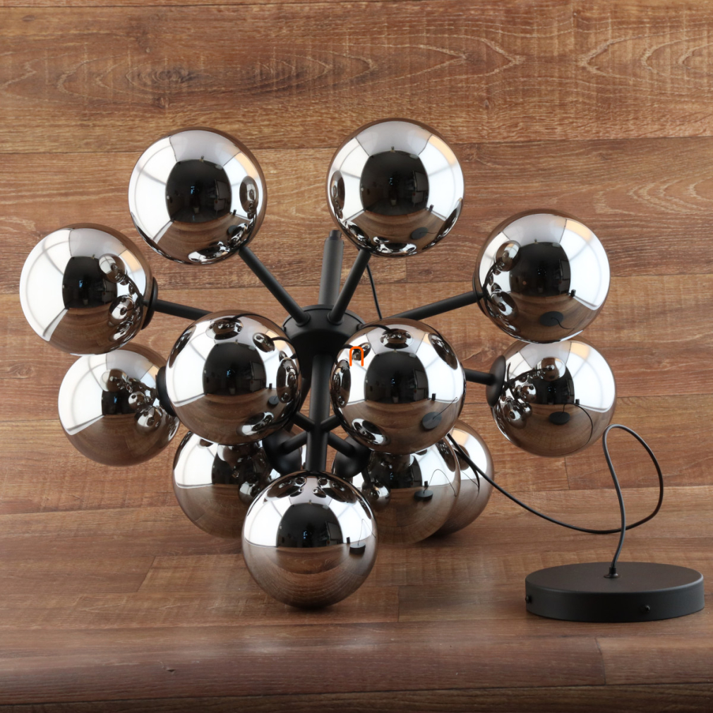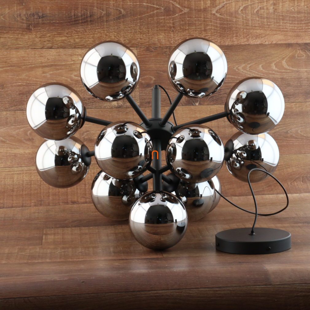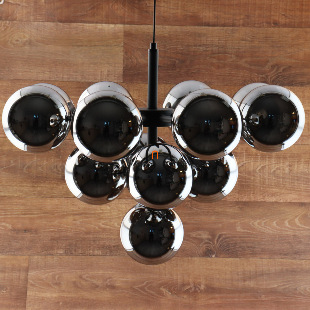 A Grappy Globo 56143-13 függesztett lámpa modern kialakítását füstszínű üveggömb búrák és matt fekete fém szerkezet jellemzi. A lámpatest összesen tizenhárom darab G9-es foglalattal rendelkezik, amelyekbe cserélhető fényforrások helyezhetők el. A termék 230 V névleges feszültséggel működik, IP20 védettségi besorolással rendelkezik, így beltéri használatra alkalmas. Az átmérője 560 mm, magassága 1200 mm. A lámpatest üvegből és fémből készült, a csomagolás méretei 58x58x35 cm, tömege 4,79 kg. A fényforrás nem tartozék, a színhőmérséklet és a fényáram a behelyezett izzótól függően változtatható.