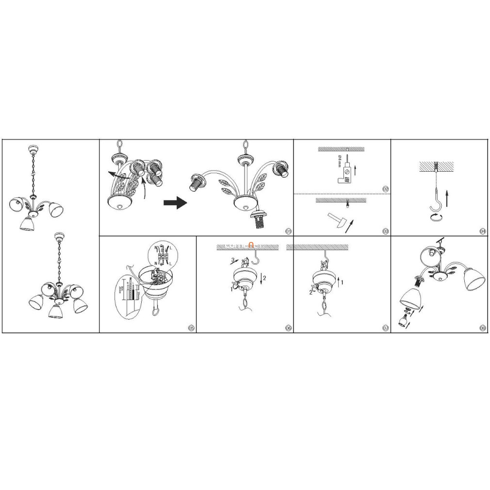A függesztés hossza rövidíthető a mennyezeti takaró elemen található csavar segítségével, amennyiben 110 centiméternél rövidebb hosszúságban szeretné a felhasználó a helyiségbe belógatni a lámpát.