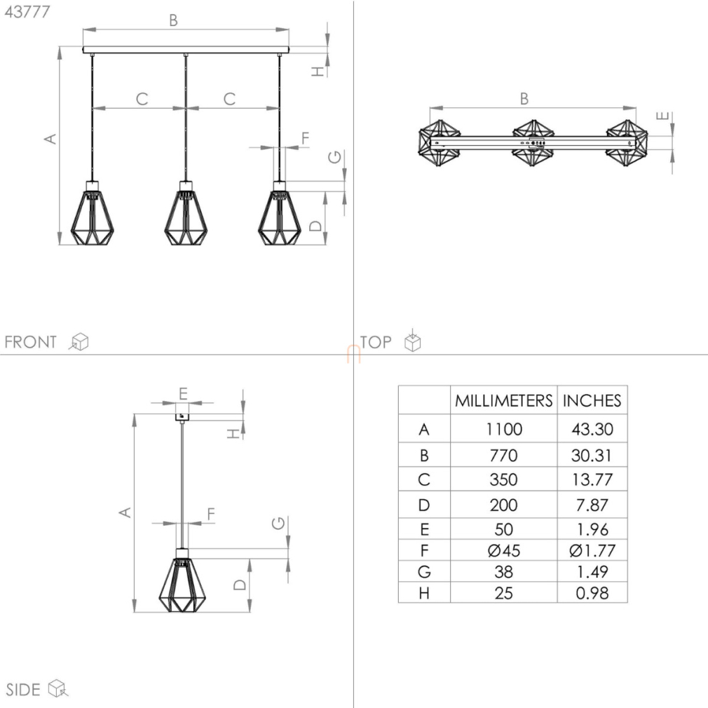 Az Adwickle Eglo 43777 függesztett lámpa három E27 foglalattal rendelkezik, fekete-barna színkombinációban. A lámpatest etno stílusú, anyaga acél és textil, amely tartósságot és esztétikus megjelenést biztosít. A lámpa méretei: hossza 870 mm, szélessége 145 mm, magassága 1100 mm, tömege 5,83 kg. A termék IP20 védettségű, nem tartalmaz fényforrást, a fényáram, fényszín és színhőmérséklet cserélhető fényforrással választható. A lámpa nem szabályozható, a csomagolás méretei: 22 x 24 x 84 cm. A gyártó az EGLO.