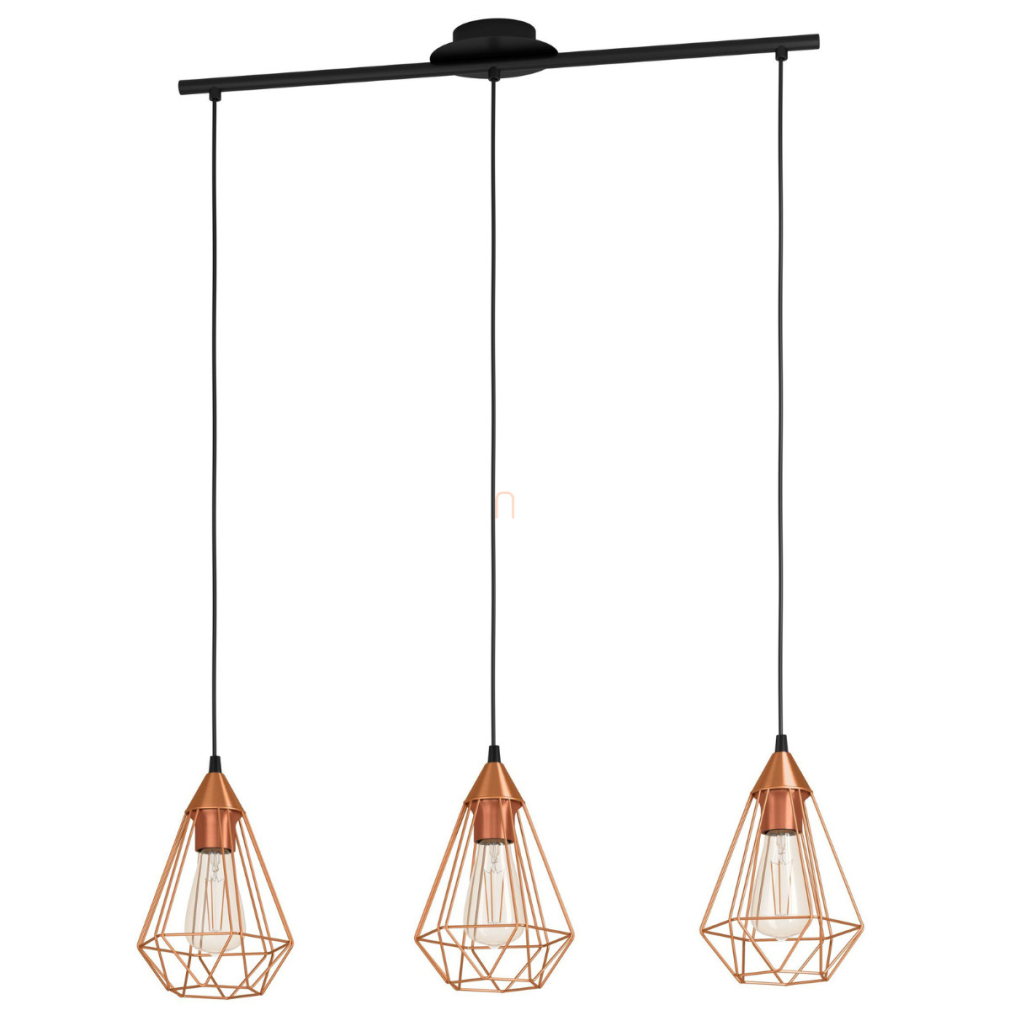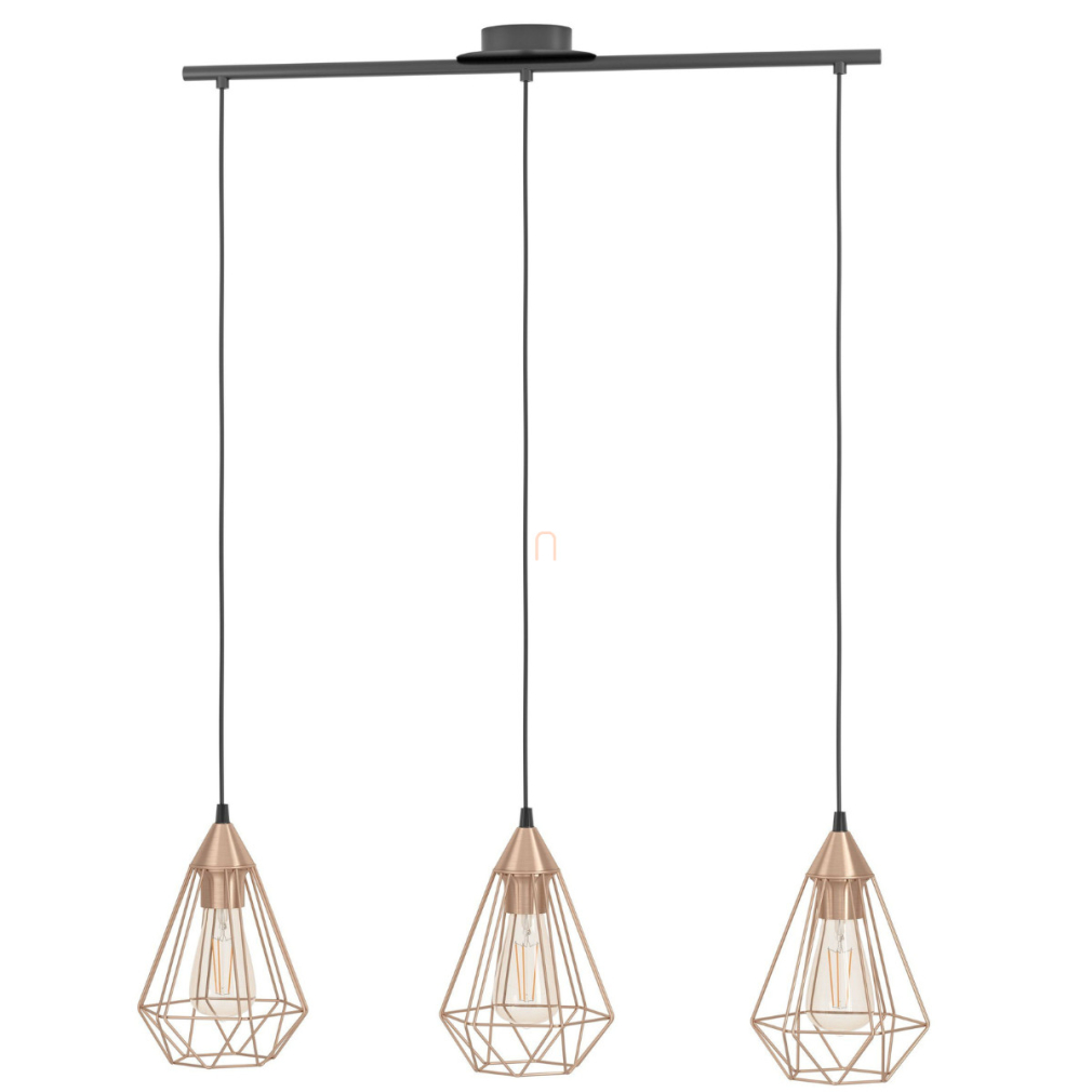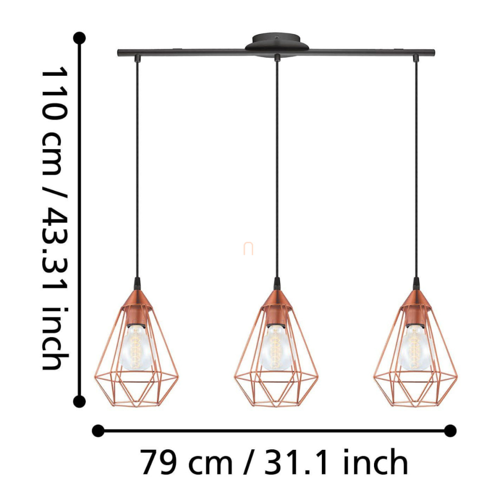 A Tarbes Eglo 94195 függesztett lámpa három E27-es foglalattal rendelkezik, így többféle cserélhető fényforrás használatát teszi lehetővé. A lámpatest anyaga acél és műanyag, felülete vörösréz színű, amely skandináv stílusú megjelenést biztosít. A lámpa méretei: hossza 790 mm, szélessége 175 mm, magassága 1100 mm, tömege 2,06 kg. A termék IP20 védettségi besorolással rendelkezik, így beltéri használatra alkalmas. A lámpatest nem tartalmaz fényforrást, a fényáram, fényszín, teljesítmény és színhőmérséklet a behelyezett izzótól függ. A termék nem szabályozható. A csomagolás méretei: 16 cm széles, 22 cm hosszú, 71 cm magas. Gyártója az EGLO. A mennyezetről függeszthető lámpákat túlnyomó részben gyárilag 110cm-es vezetékhosszal, valamint a hálózati bekötést és a rögzítést fedő takaró elemmel (un. „mennyezet rózsa”) látják el.