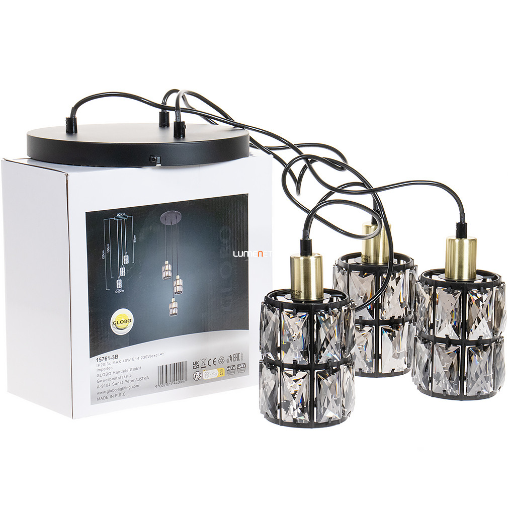 A Wolli Globo 15761-3B függesztett lámpa modern megjelenését a fekete-arany színkombináció és az üvegkristály berakások teszik különlegessé. A lámpatest három darab E14 foglalattal rendelkezik, amelyekhez cserélhető fényforrások illeszthetők, így a fényáram, fényszín és színhőmérséklet igény szerint alakítható. A 2,6 kg tömegű szerkezet fő anyaga a fém, amelyet üveg kristály elemek egészítenek ki, biztosítva a tartósságot és a dekoratív hatást. A 250 mm átmérőjű, 1200 mm magasságú lámpa nem szabályozható, IP20 védettséggel rendelkezik, így beltéri használatra alkalmas. A termék nem tartalmaz fényforrást, a csomagolás méretei 14x26x26 cm. Gyártója a Globo.