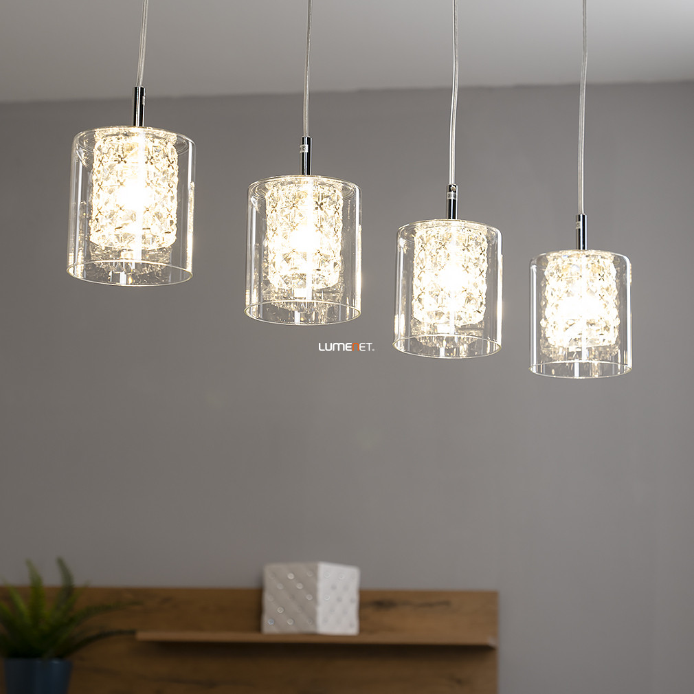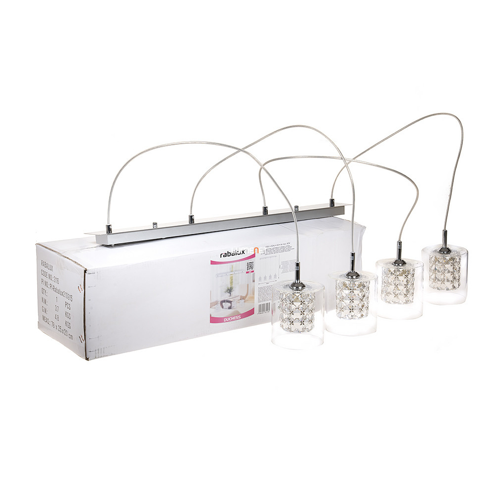 A Duchess Rábalux 3116 függesztett lámpa modern megjelenést kínál, kristály láncokkal és üveg hengeres elemekkel kombinálva. A lámpatest négy darab G9 foglalattal rendelkezik, amelyekbe cserélhető fényforrások helyezhetők el, így a fényáram, a színhőmérséklet és a teljesítmény is szabadon választható. A lámpa fém és üveg anyaghasználata, valamint króm és áttetsző színei elegáns összhatást biztosítanak. A termék IP20 védettségi besorolású, beltéri használatra alkalmas. Méretei: 720 mm hosszúság, 120 mm szélesség és 1200 mm magasság. A csomagolás mérete 78x25x20 cm, a termék tömege 4,64 kg. A lámpatest nem tartalmaz fényforrást, szabályozhatósága nem lehetséges.