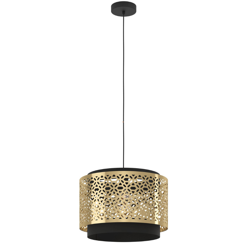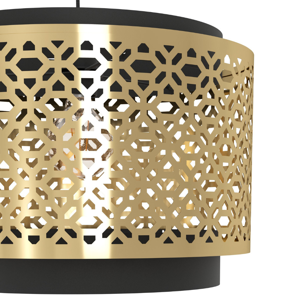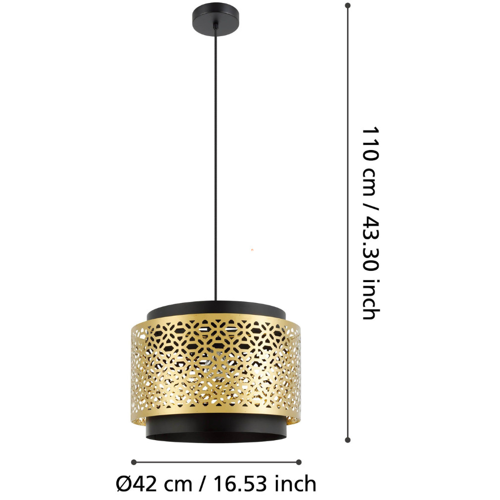 A Sandbach Eglo 43981 függesztett lámpa modern marokkói stílusban készült, amely egyesíti a hagyományos keleti motívumokat a korszerű formavilággal. A lámpatest acélból készült, fekete és sárgaréz színkombinációval, amely karakteres megjelenést kölcsönöz bármely enteriőrnek. Az E27-es foglalattal egy darab cserélhető fényforrás helyezhető bele, amely nem tartozék, így a fényáram, fényszín, teljesítmény és színhőmérséklet szabadon választható. A lámpa átmérője 420 mm, maximális magassága 1100 mm, így jól alkalmazható étkezők, nappalik vagy előszobák központi világításaként. IP20 védettsége beltéri használatra teszi alkalmassá, és a precíz kivitelezés a tartósságot is biztosítja. A termék logisztikai kódja 43981, csomagolási méretei: 43 cm szélesség, 25 cm hosszúság és 43 cm magasság.
