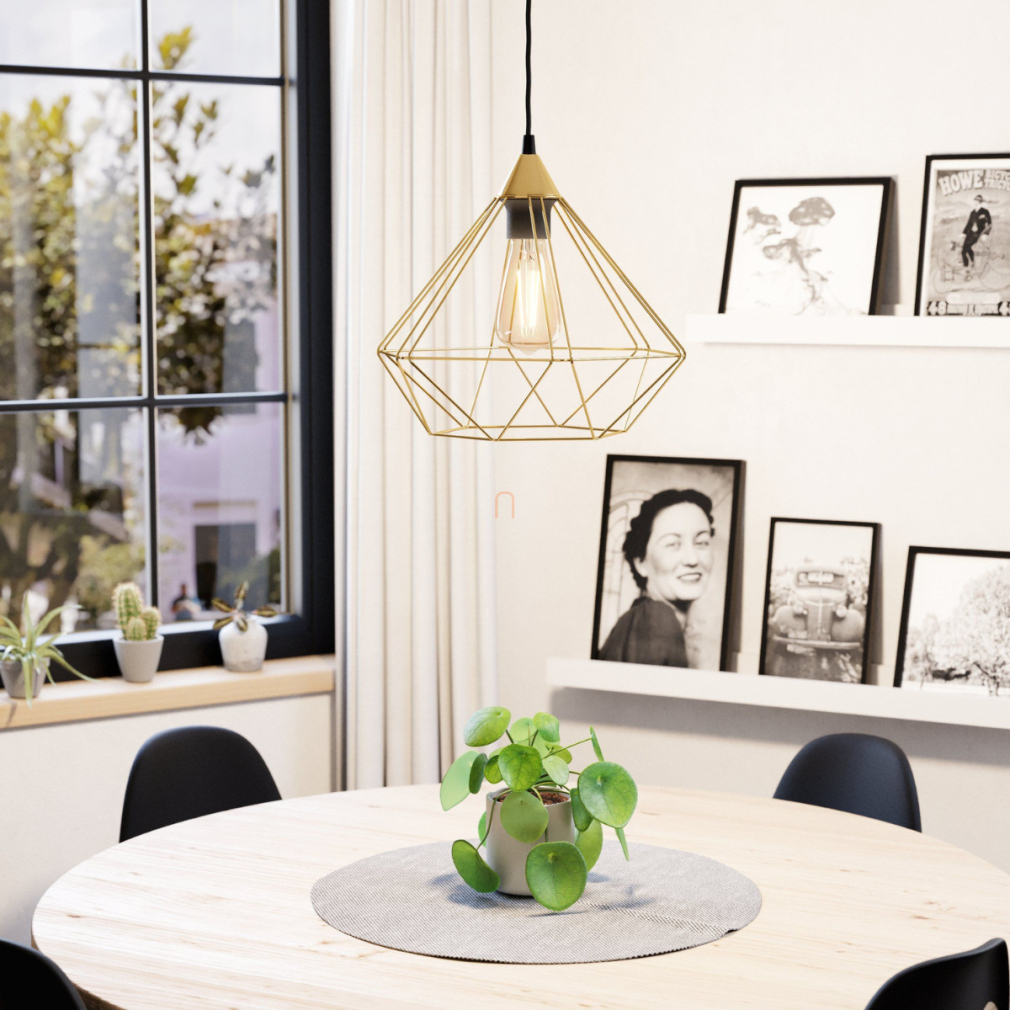 A Tarbes Eglo 43679 sárgaréz színű függesztett lámpa egy karakteres, ugyanakkor légies világítási megoldás, amely különösen jól illik azokhoz a terekhez, ahol az ipari design, a vintage stílus és a modern minimalizmus találkozik. Ez a modell egyetlen lámpatestből áll, és a Tarbes kollekcióra jellemző módon egy geometrikus dróthálós burával rendelkezik, amely nem rejti el a fényforrást, hanem épp ellenkezőleg: kiemeli azt a dizájn központi elemévé.