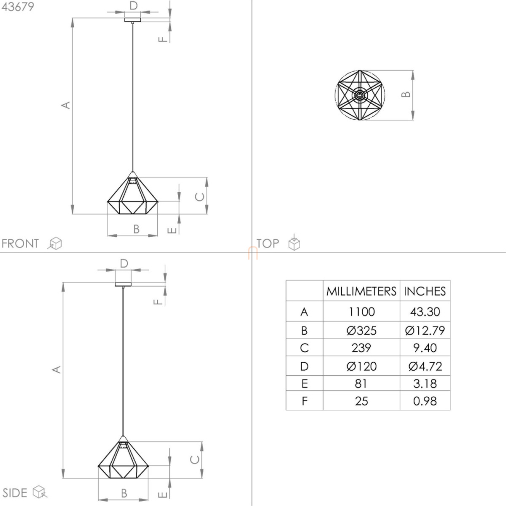 A Tarbes Eglo 43679 függesztett lámpa sárgaréz színű acélból készült, egyedi geometrikus kialakítással. A lámpatest 1 db E27 foglalattal rendelkezik, amely cserélhető fényforrás használatát teszi lehetővé, így a fényáram, fényszín, teljesítmény és színhőmérséklet szabadon választható. A termék nem szabályozható, IP20 védettséggel rendelkezik, így beltéri használatra alkalmas. A lámpa átmérője 325 mm, magassága 1100 mm, tömege 1,63 kg. A csomagolás méretei: 31 cm szélesség, 34 cm hosszúság, 25 cm magasság. A gyártó az EGLO.