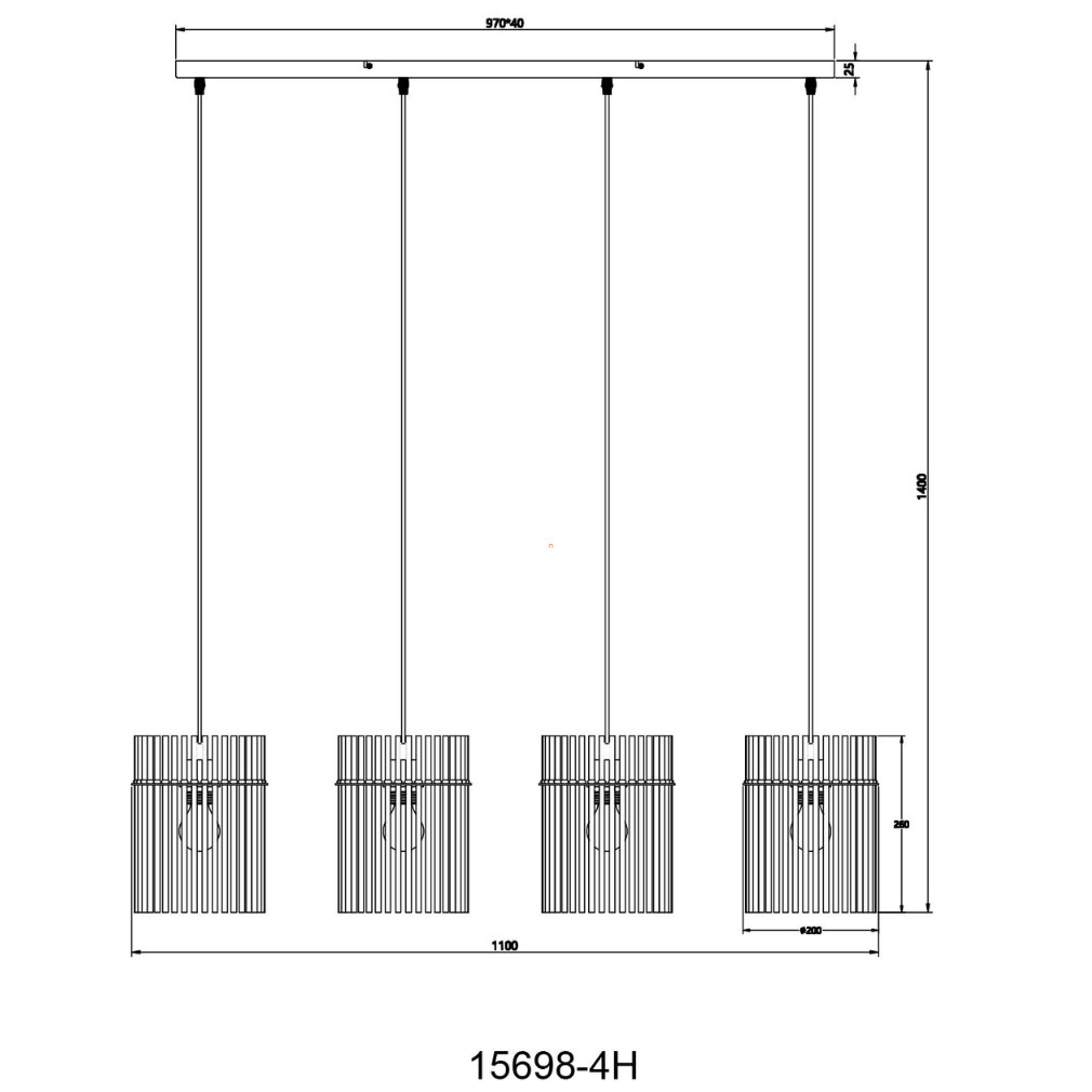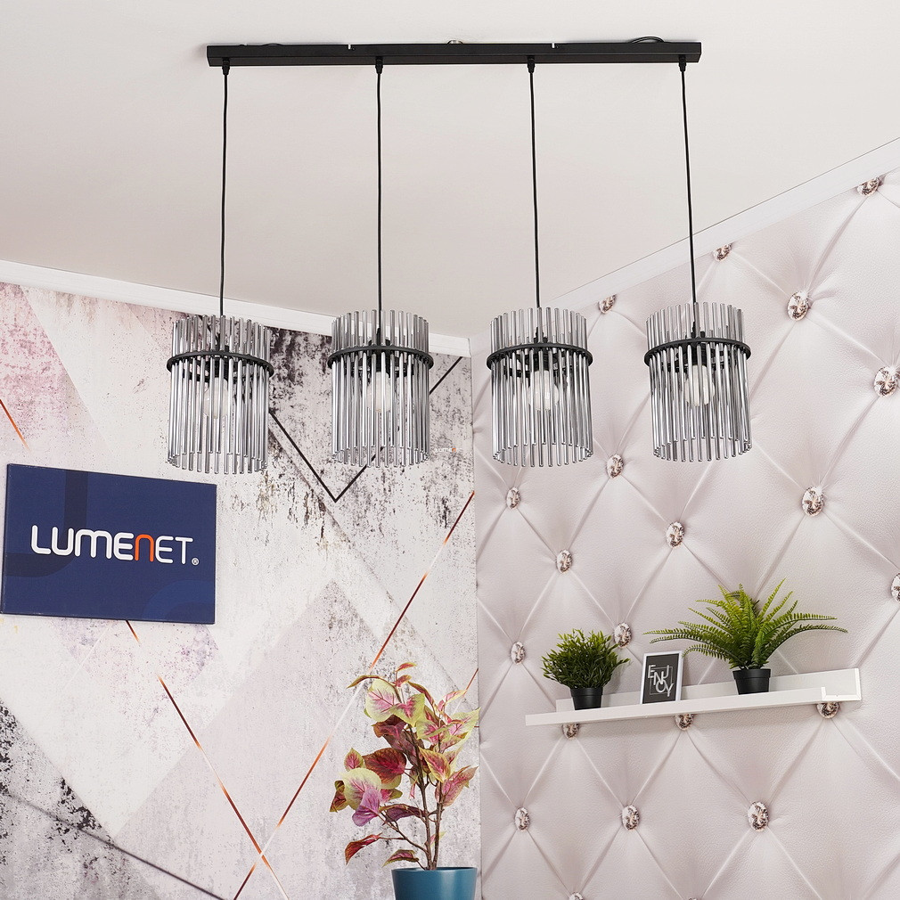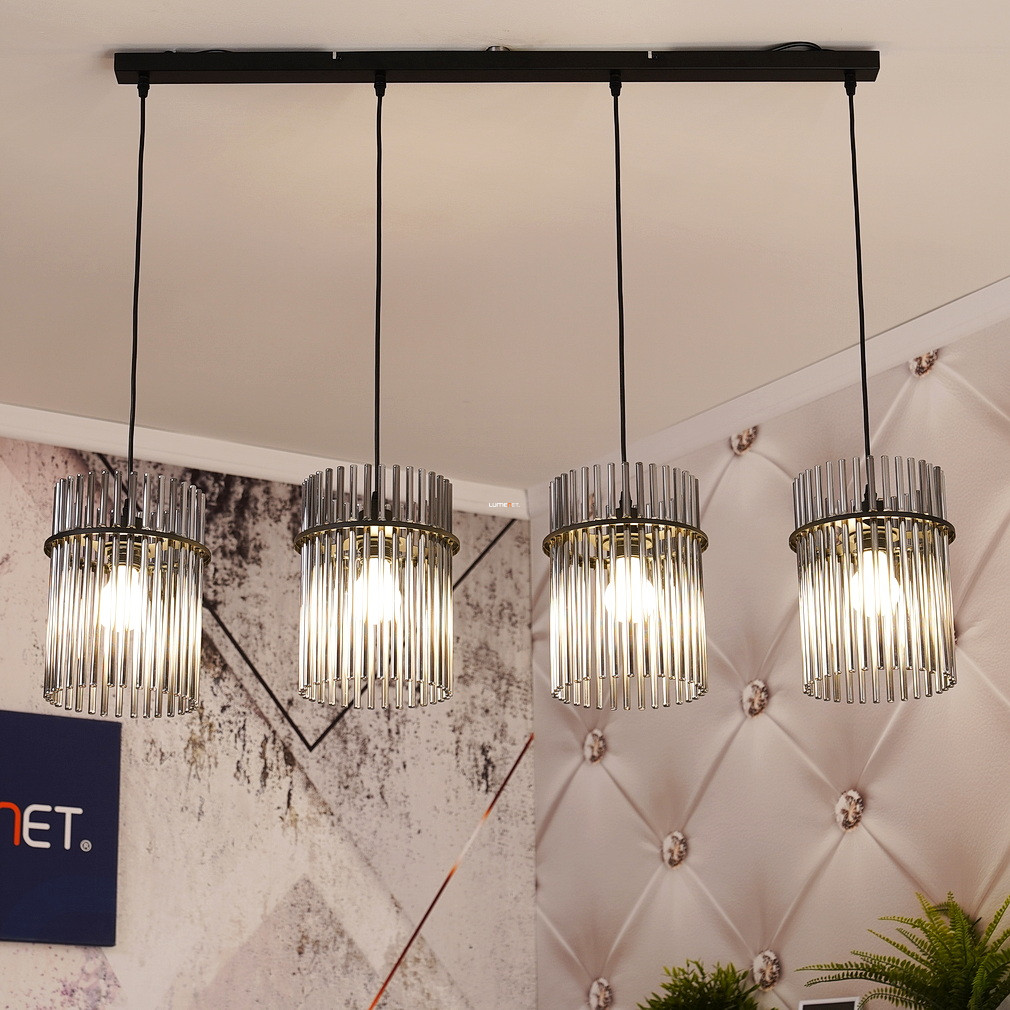 A Gorley Globo 15698-4H függesztett lámpa üvegpálcás búrákkal modern lakásvilágítási megoldás, amely négy darab E27-es foglalattal rendelkezik. A lámpatest fő anyaga üveg és fém, matt fekete és füstszínű kivitelben, így elegáns megjelenést biztosít bármely enteriőrben. A termék teljes hossza 1100 mm, szélessége 200 mm, magassága pedig 1400 mm, így ideális nagyobb terek megvilágítására is. A lámpatest IP20 védettségi besorolással rendelkezik, amely beltéri használatra teszi alkalmassá. A fényforrás nem tartozék, így a felhasználó szabadon választhatja meg a megfelelő E27-es izzókat, akár különböző színhőmérséklettel és teljesítménnyel. A névleges feszültség 230 V, a termék tömege 6,63 kg. A Gorley Globo 15698-4H logisztikai kódja 15698-4H, a gyártó a Globo.