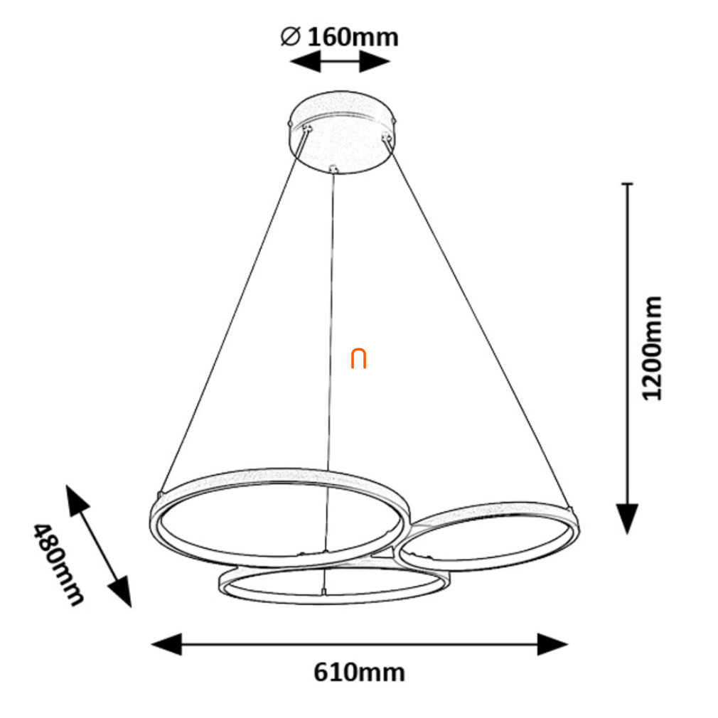A Formand Rábalux 72297 tripla függesztett LED lámpa modern, minimál stílusú világítótest, amelyet elsősorban lakásvilágítási célokra terveztek. A lámpatest 38 wattos beépített LED modullal működik, amely 1100 lumen fényáramot biztosít melegfehér, 3000 K színhőmérséklet mellett. A termék energiaosztálya G, átlagos élettartama 30 000 óra. A lámpa fém és műanyag anyaghasználattal, fekete-fehér színkombinációban készül, IP20 védettséggel rendelkezik, így beltéri használatra alkalmas. A lámpatest 610 mm hosszú és széles, magassága 1200 mm. A 230 V névleges feszültséggel működő világítótest tartalmazza a LED fényforrást, és logisztikai kódja 72297.