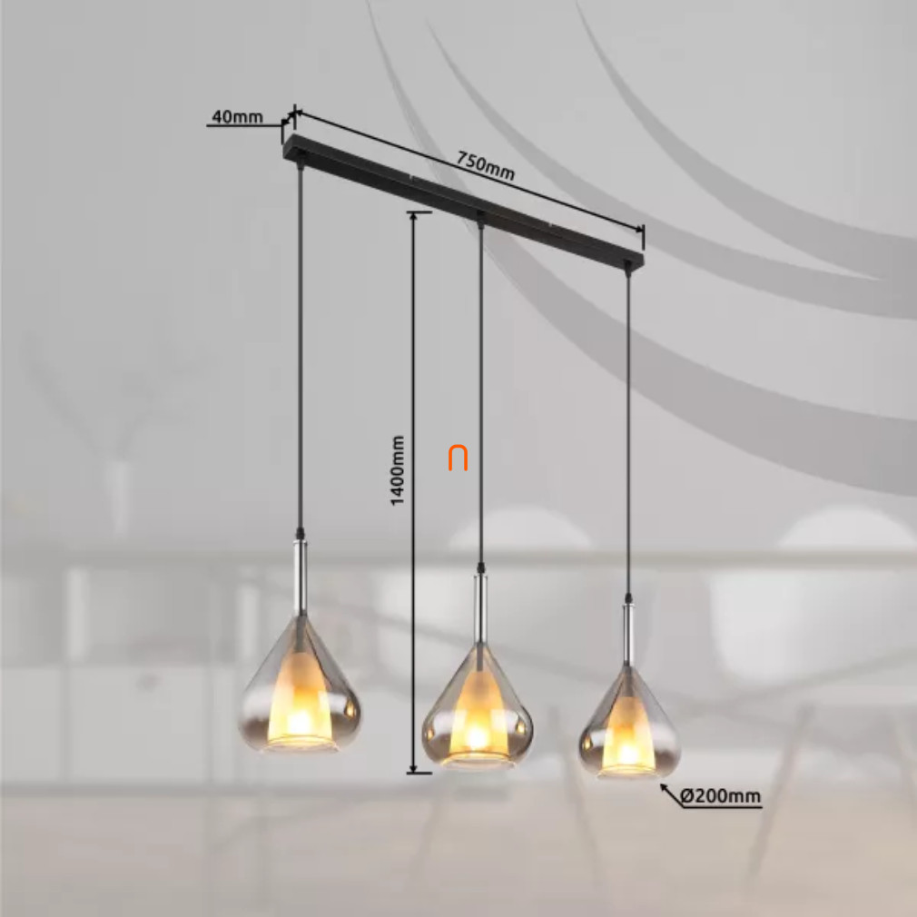A Geeky Globo 15542-3 függesztett üveg lámpa három E27 foglalattal rendelkezik, így cserélhető fényforrásokkal használható, amelyek színhőmérséklete és fényárama szabadon választható. A lámpatest matt fekete és füstszínű üvegből készült, anyaga fém és üveg kombinációja. A termék mérete 900 mm hosszú, 200 mm széles és 1400 mm magas, névleges feszültsége 230 V. A védettségi szint IP20, így beltéri használatra alkalmas. A csomag nem tartalmaz fényforrást. A gyártó a Globo, a termék logisztikai kódja 15542-3, tömege 4,36 kg.