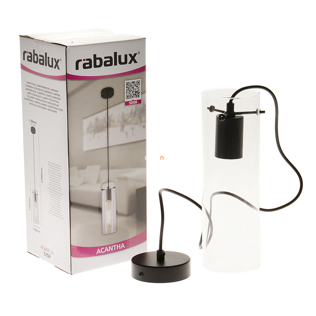 Az Acantha Rábalux 5258 függesztett üveg lámpa modern designnal és kompakt, 9 cm-es átmérővel rendelkezik. A lámpatest fém és üveg anyagokból készült, fekete és áttetsző színkombinációval. Egy darab E27 foglalattal szerelt, amely lehetővé teszi a cserélhető fényforrás használatát, így a fényáram, teljesítmény és színhőmérséklet igény szerint választható. A lámpa magassága 1200 mm, védettsége IP20, amely beltéri használatra teszi alkalmassá. A termék súlya 0,7 kg, csomagolási méretei 14x14x35 cm. A lámpa nem tartalmaz fényforrást, a gyártó a Rábalux.