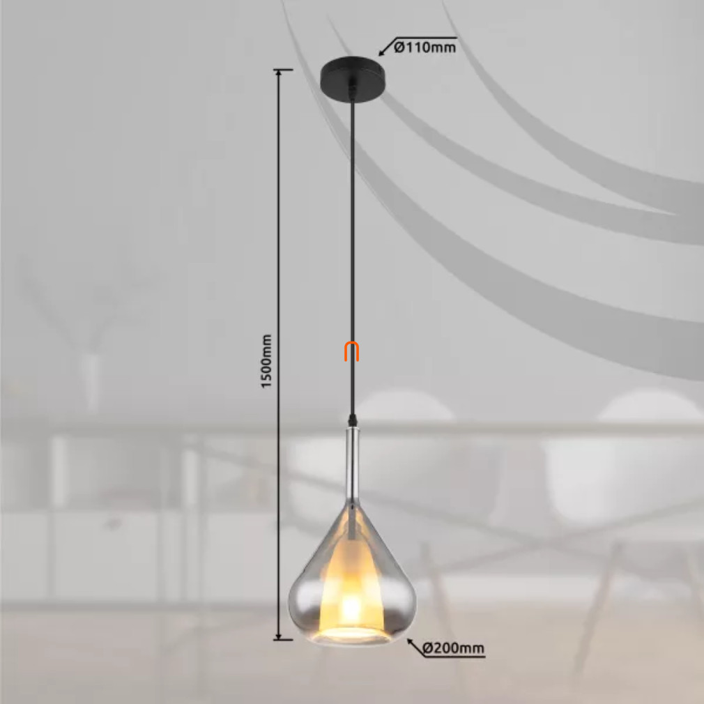 A Geeky Globo 15542 függesztett üveg lámpa modern megjelenésű világítótest, amely 1,3 kg tömegű, anyaga fém és üveg kombinációja. A lámpatest 1 darab E27 foglalattal rendelkezik, amelybe cserélhető fényforrás helyezhető, így a fényáram, a színhőmérséklet és a teljesítmény a kiválasztott izzótól függően változtatható. A lámpa névleges feszültsége 230 V, védettségi besorolása IP20, azaz beltéri használatra alkalmas. A matt fekete és füstszínű kivitel elegáns megjelenést kölcsönöz a lámpának. Az átmérője 200 mm, magassága 1500 mm. A termék nem tartalmaz fényforrást. Csomagolási méretei: 26x26x45 cm. A lámpát a Globo. gyártja.