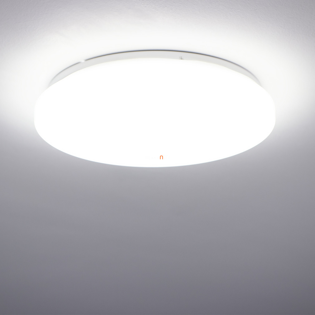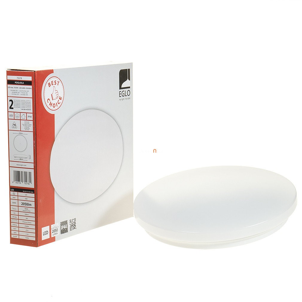 A Pogliola Eglo 75578 egy 31 cm átmérőjű, fehér színű, funkcionális kialakítású mennyezeti LED lámpa, amely kiválóan alkalmas fürdőszobai használatra. A lámpatest 18 W teljesítményű, beépített LED modullal rendelkezik, amely 1900 lumen fényáramot biztosít hidegfehér, 4000 K színhőmérsékletű fénnyel. Az IP44 védettségnek köszönhetően ellenáll a fröccsenő víznek, így nedves helyiségekben is biztonságosan alkalmazható. Az acél és műanyag anyaghasználat hosszú élettartamot és megbízható működést garantál. A lámpa nem szabályozható, a fényforrás a termék részét képezi, így azonnal telepíthető. A termék tömege 0,52 kg, magassága 55 mm, logisztikai kódja 75578.
