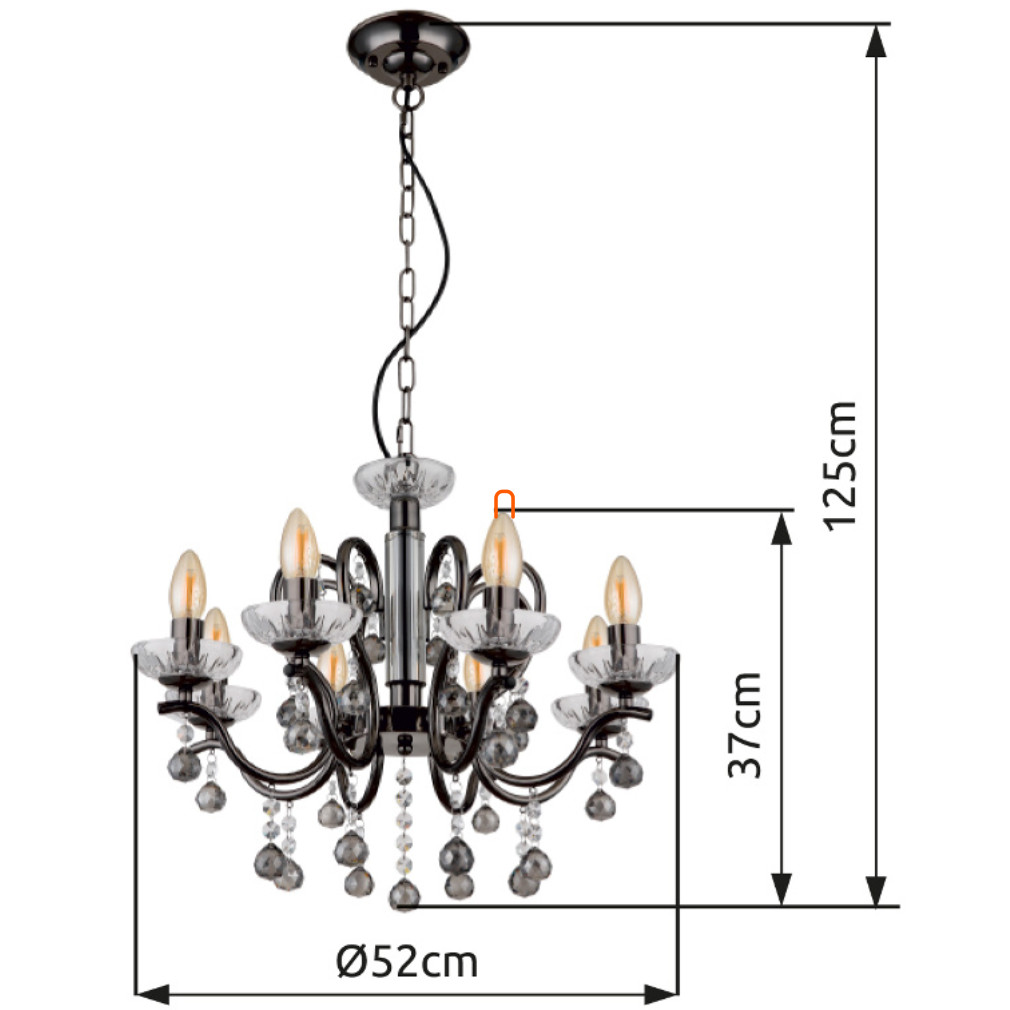 A Camila Globo 64134-8 füstszínű csillár modern és elegáns megjelenést biztosít bármely lakótérben. Az E14 foglalatokkal ellátott lámpatest összesen nyolc darab cserélhető fényforrással működtethető, amelyek nem tartozékai a csomagnak. A csillár 230 V névleges feszültségen üzemel, védettségi besorolása IP20. A lámpatest anyaga fém és kristály, az üvegből készült kristály elemek füstszínű, szürke árnyalatban jelennek meg. Az átmérője 520 mm, magassága 1250 mm, tömege 6,15 kg. A termék csomagolási méretei: 47x47x24 cm. A Camila Globo 64134-8 csillár kiválóan alkalmas lakásvilágítási célokra, letisztult formavilága és minőségi anyaghasználata révén harmonikusan illeszkedik modern enteriőrökbe.