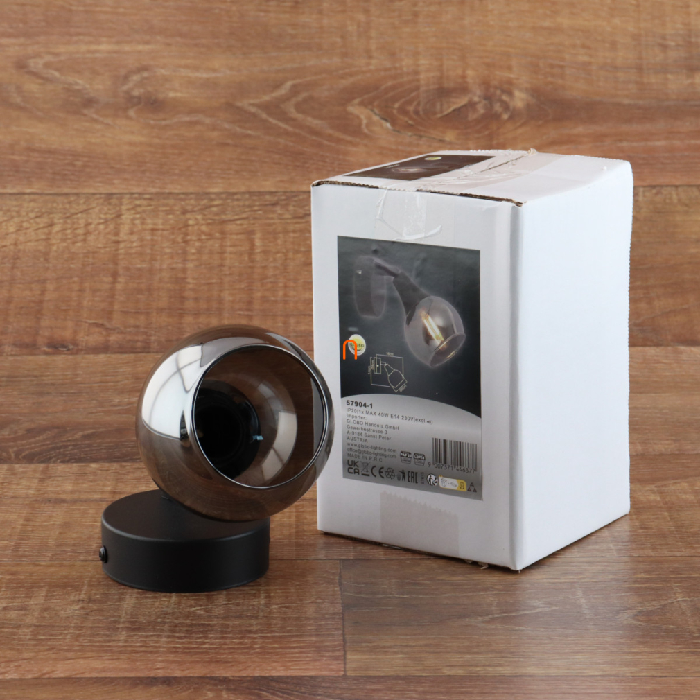 A Glyptar Globo 57904-1 füstszínű fali spot lámpa modern megjelenésű, matt fekete fém és füstszínű üveg kombinációjával készült. A lámpatest egy darab E14 foglalattal rendelkezik, amelybe cserélhető fényforrás helyezhető. A termék 230 V névleges feszültséggel működik, védettsége IP20, így beltéri használatra alkalmas. A lámpa méretei 90 mm szélesség és 140 mm magasság, tömege 0,3 kg. A csomagolás méretei 11x11x18 cm. A fényforrás nem tartozék, így a fényáram, színhőmérséklet és teljesítmény a választott izzótól függően változik. A lámpa logisztikai kódja: 57904-1, gyártója a Globo.