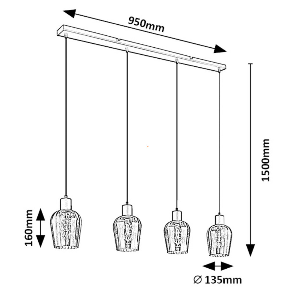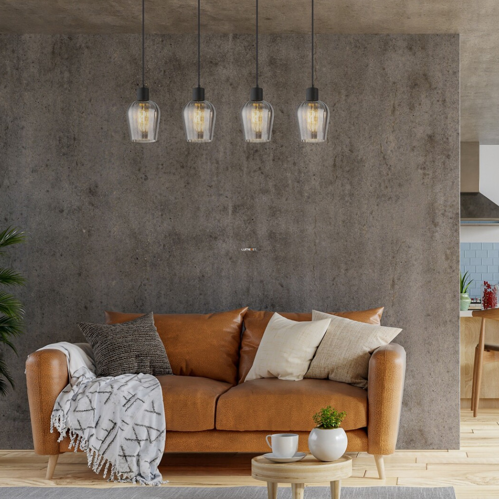 A Florian Rábalux 72271 füstszínű függesztett lámpa modern formatervezéssel és négy E27 foglalattal rendelkezik, amelyek lehetővé teszik a cserélhető fényforrások alkalmazását. A lámpatest matt fekete fém és füstszínű üveg kombinációjából készült, ami esztétikus megjelenést biztosít. A termék teljes hossza 950 mm, átmérője 135 mm, magassága 1500 mm, így tágasabb belső terekben is jól érvényesül. A névleges feszültség 230 V, a védettségi szint IP20-as, ami beltéri használatra alkalmassá teszi. A lámpa nem tartalmaz fényforrást, ezért a fényáram, fényszín, teljesítmény és színhőmérséklet a választott izzótól függ. A termék tömege 2,7 kg, csomagolási méretei pedig 96 cm hosszú, 21 cm széles és 15 cm magas. A lámpa gyártója a Rábalux.
