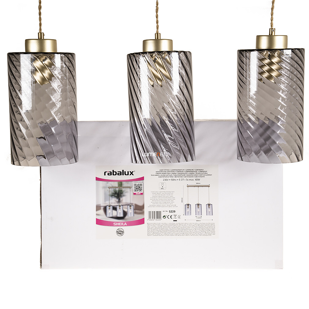 A Sheila Rábalux 5229 füstszínű függesztett lámpa modern kialakításával és három E27-es foglalatával ideális választás tágas belső terek világítására. A lámpatest fém és üveg anyaghasználata garantálja a tartósságot és az elegáns megjelenést, míg a füstszínű üveg burák és az arany színű textilkábel harmonikus összhangot teremtenek. A lámpa teljes hossza 1800 mm, szélessége 150 mm, hossza 670 mm, így tökéletesen illeszkedik étkezők, nappalik vagy előterek mennyezetére. Az IP20-as védettségi szint beltéri használatra teszi alkalmassá a terméket. A lámpatest cserélhető fényforrással működik, a fényforrás nem tartozék, így szabadon választható a kívánt fényerő és színhőmérséklet. A termék tömege 4,7 kg, csomagolási méretei 59x20x36 cm. A logisztikai kód: 5229. Gyártója a Rábalux.