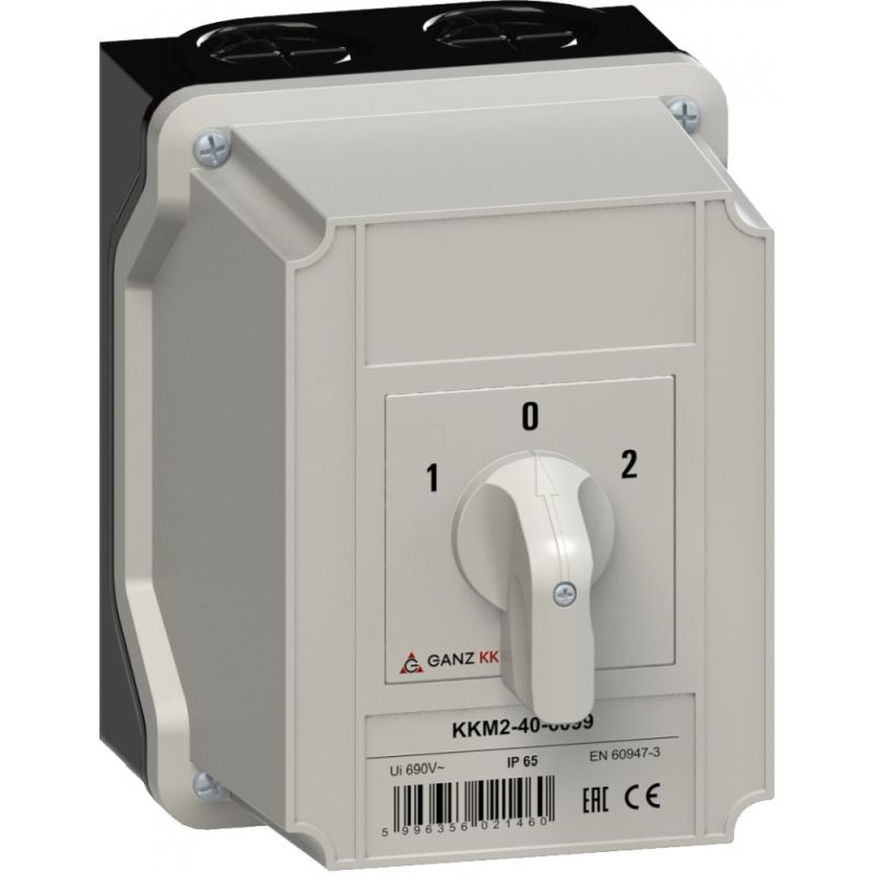 Ganz KKM2-40-6099 Átkapcsoló 0 állással, tokozott kézikapcsoló 40A, 1-0-2 felirat, IP65, 4P