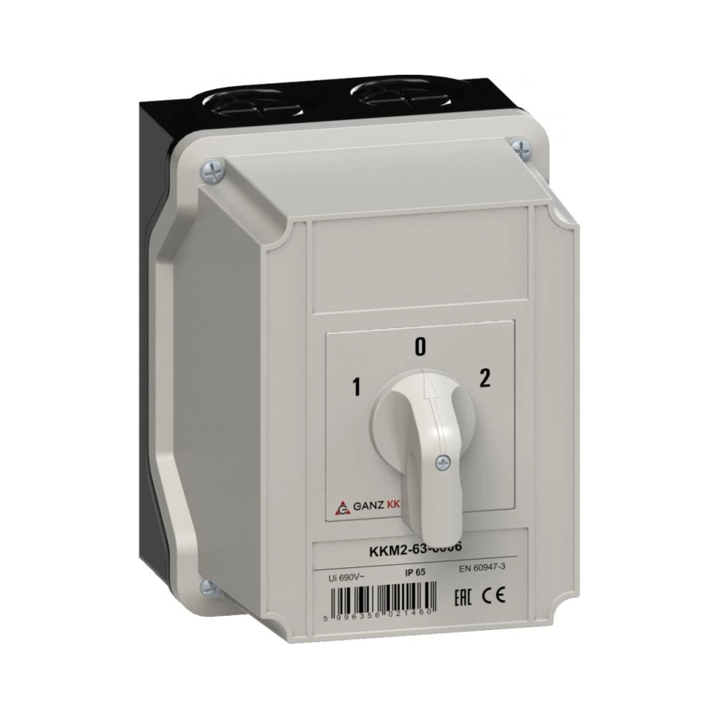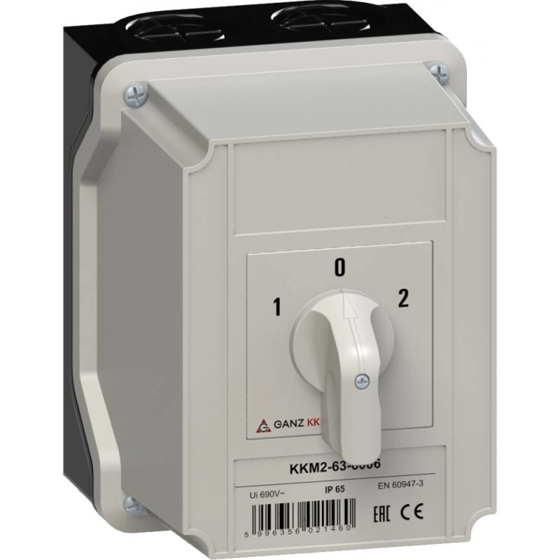 Ganz KKM2-63-6006 Átkapcsoló 0 állással, tokozott kézikapcsoló 63A, 1-0-2 felirat, IP65, 3P