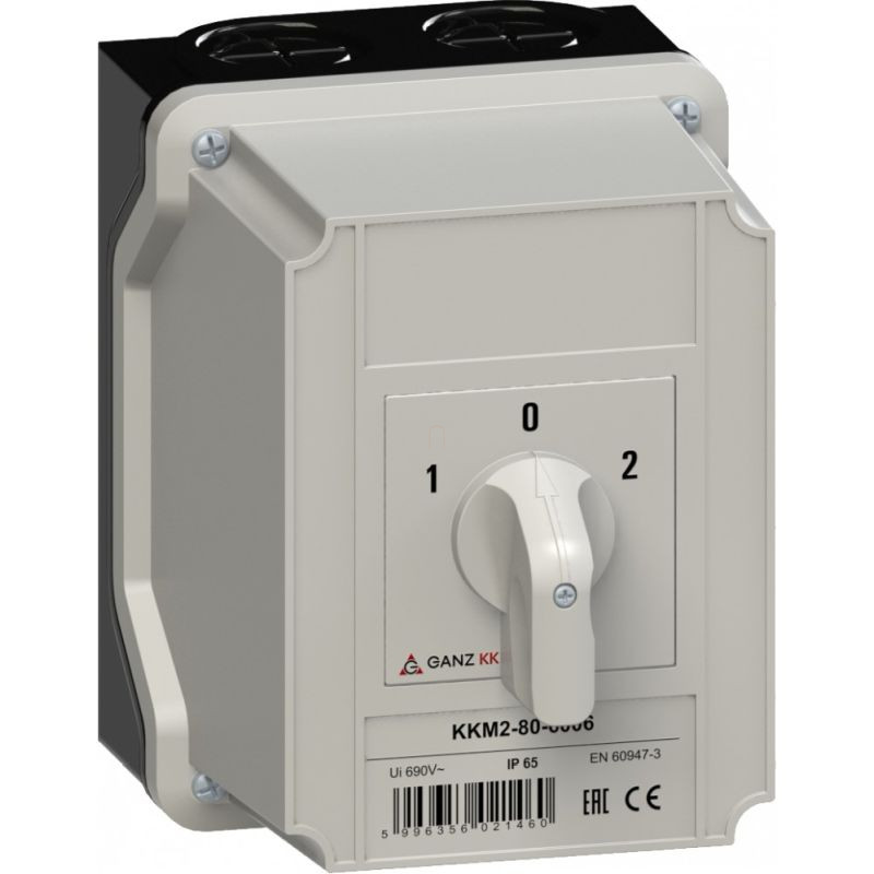 Ganz KKM2-80-6006 Átkapcsoló 0 állással, tokozott kézikapcsoló 80A, 1-0-2 felirat, IP65, 3P