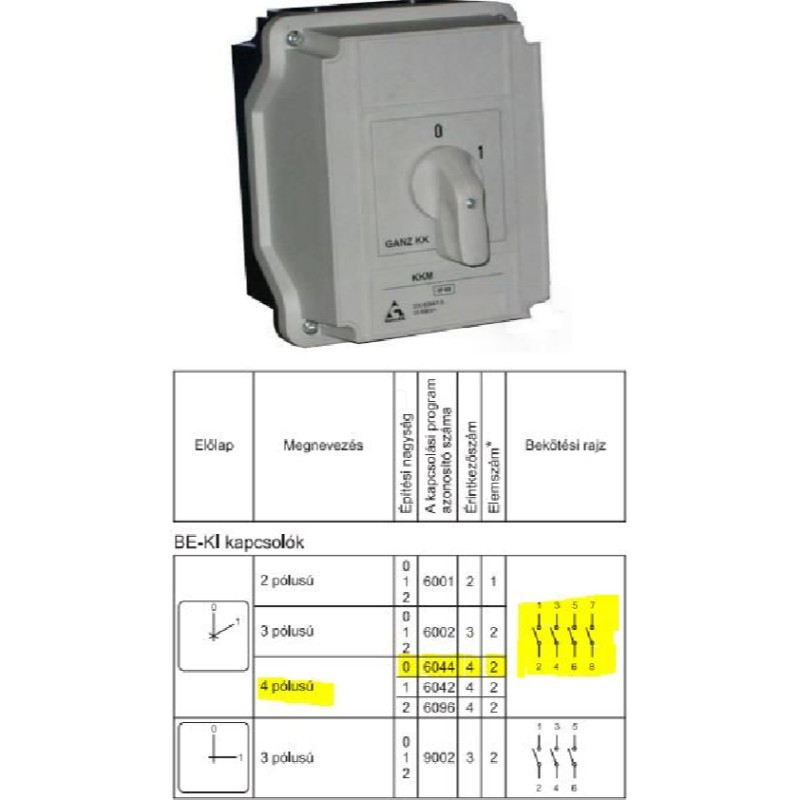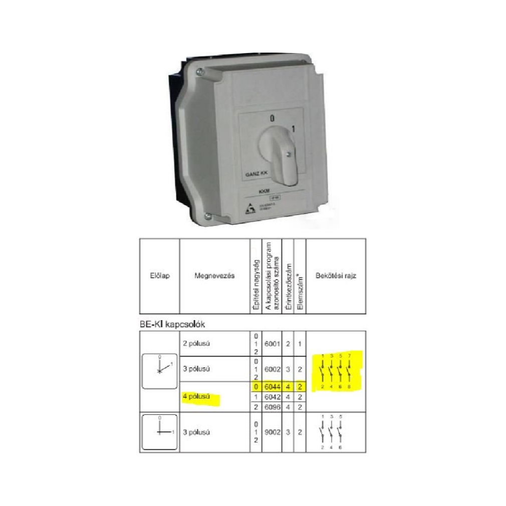 KKMZ0-20-6044 M1 BE-KI kapcsoló, tokozott, kulcsos működtetésű kézikapcsoló 20A, IP42, 4P, KK1 tokozatába építve, Ganz