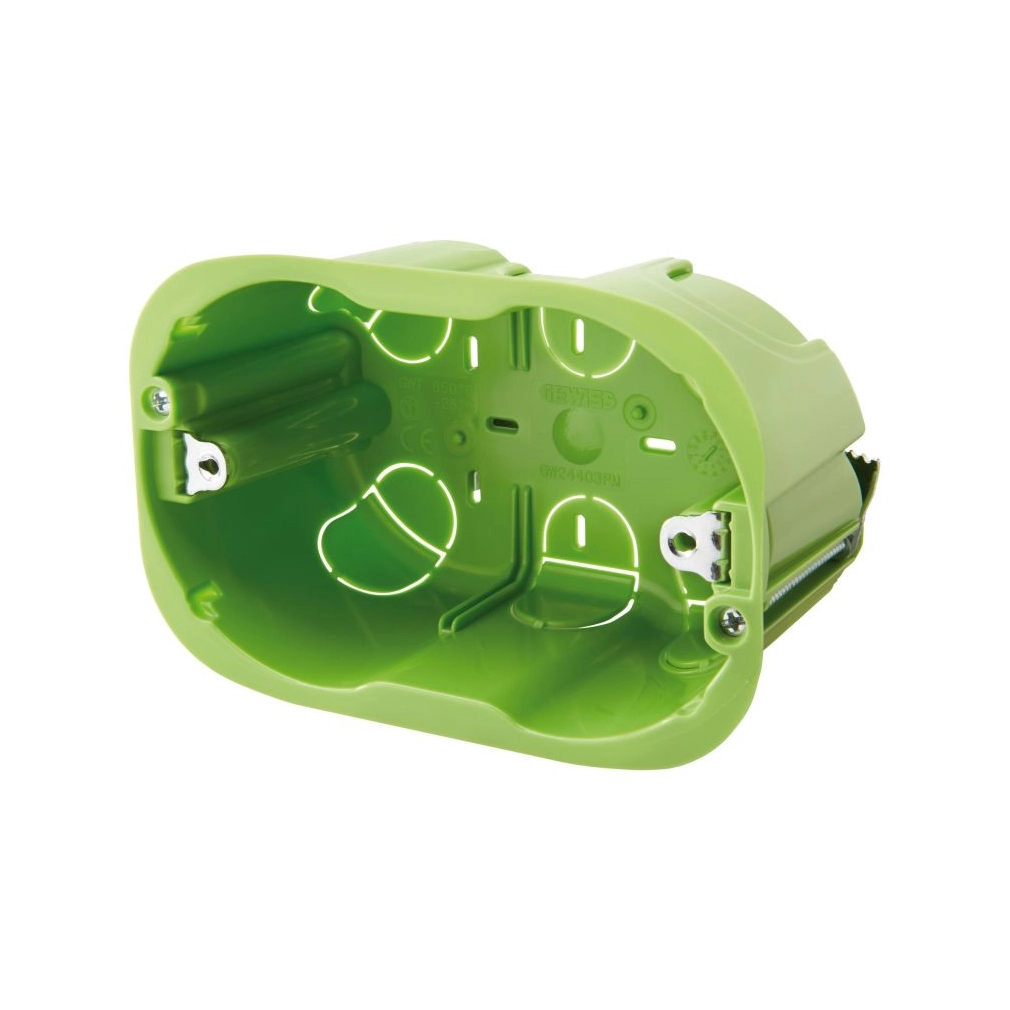 \nNagy ellenállőképesség a mechanikai igénybevétellel és a nyomással szemben. Szerszám nélkül eltávolítható kikönnyítések. GW24403PM, GW24404PM, GW24406PM szerelvénydobozok állítható szerelési mélységet biztosító elveszíthetetlen fém felfogató fülekkel és betétekkel. GW24237PM fülekkel, a panelekre vagy fémszerkezetre szereléshez.\nA téglalap alakú dobozok helyes beépítéséhez 68 mm átmérőjű maró használata ajánlott.