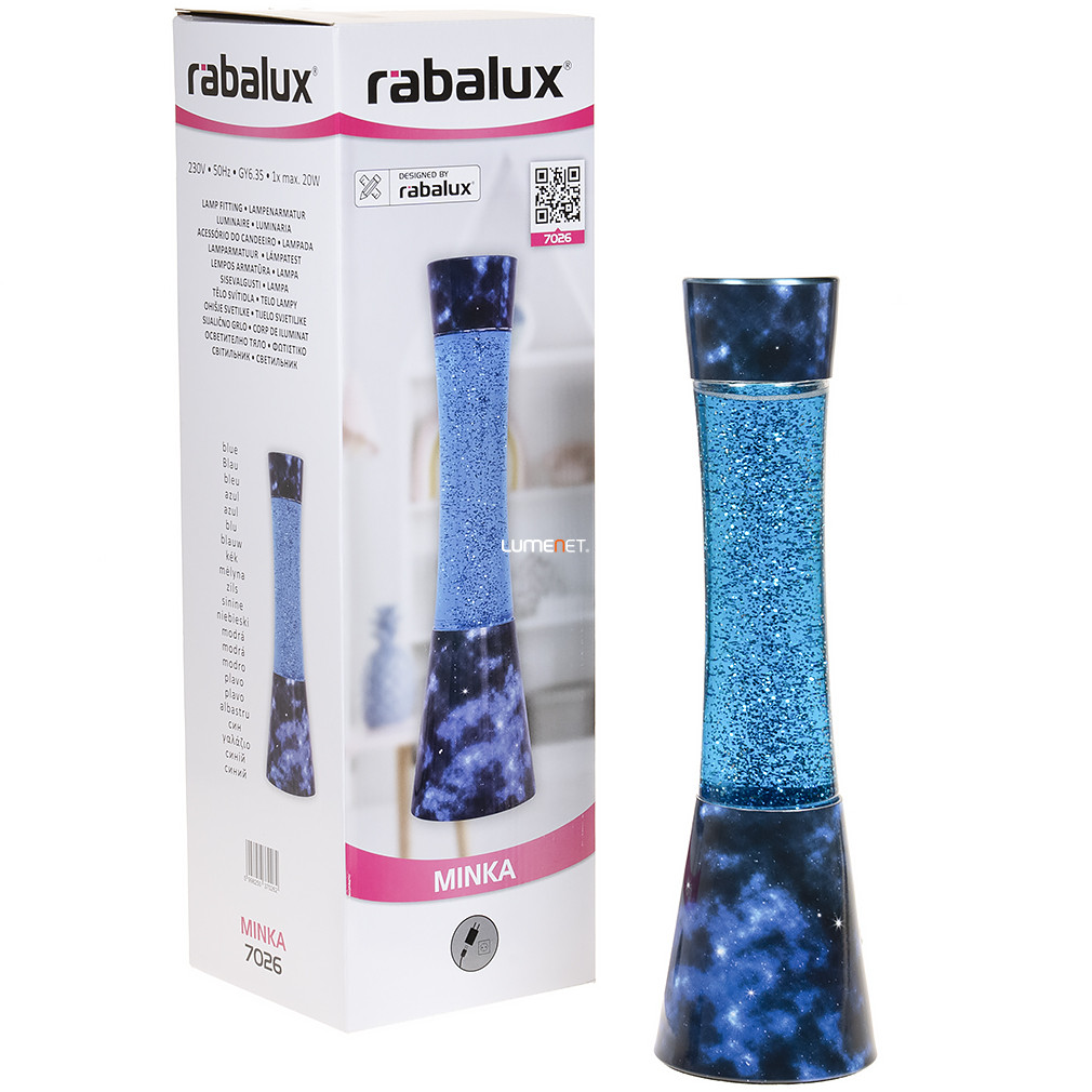 A Minka Rábalux 7026 glitteres lávalámpa univerzum hatással, 39 cm-es magassággal és 110 mm átmérővel rendelkezik. A lámpa kék színű, dekorációs stílusú, fém és üveg anyagból készült. Egy GY6.35 foglalattal szerelt, amelyhez a fényforrás tartozék. A fényforrás cserélhető, a lámpa nem szabályozható. IP20 védettséggel ellátott, így beltéri használatra alkalmas. Teljes tömege 1,87 kg. A csomagolás méretei: 15 x 15 x 51 cm, a kábel hossza 1,8 méter. A termék a Rábalux gyártásában készült, logisztikai kódja 7026.