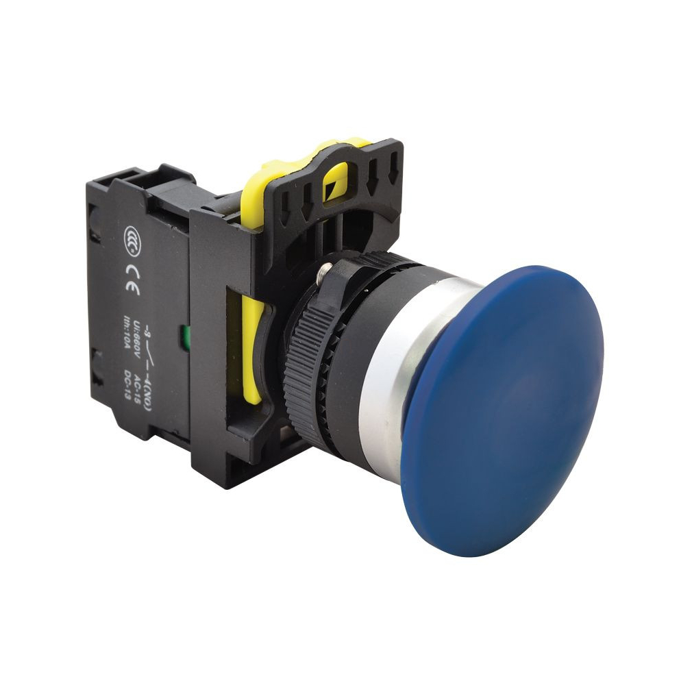 Gombafejű nyomógomb, kék 1×NO, 5A/230V 40mm, IP65 NYG3-MB Tracon