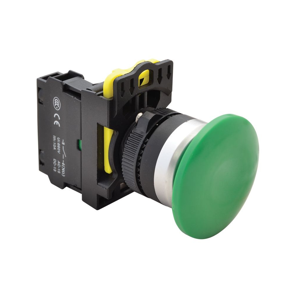 Gombafejű nyomógomb, zöld 1×NO, 5A/230V 40mm, IP65 NYG3-MG Tracon