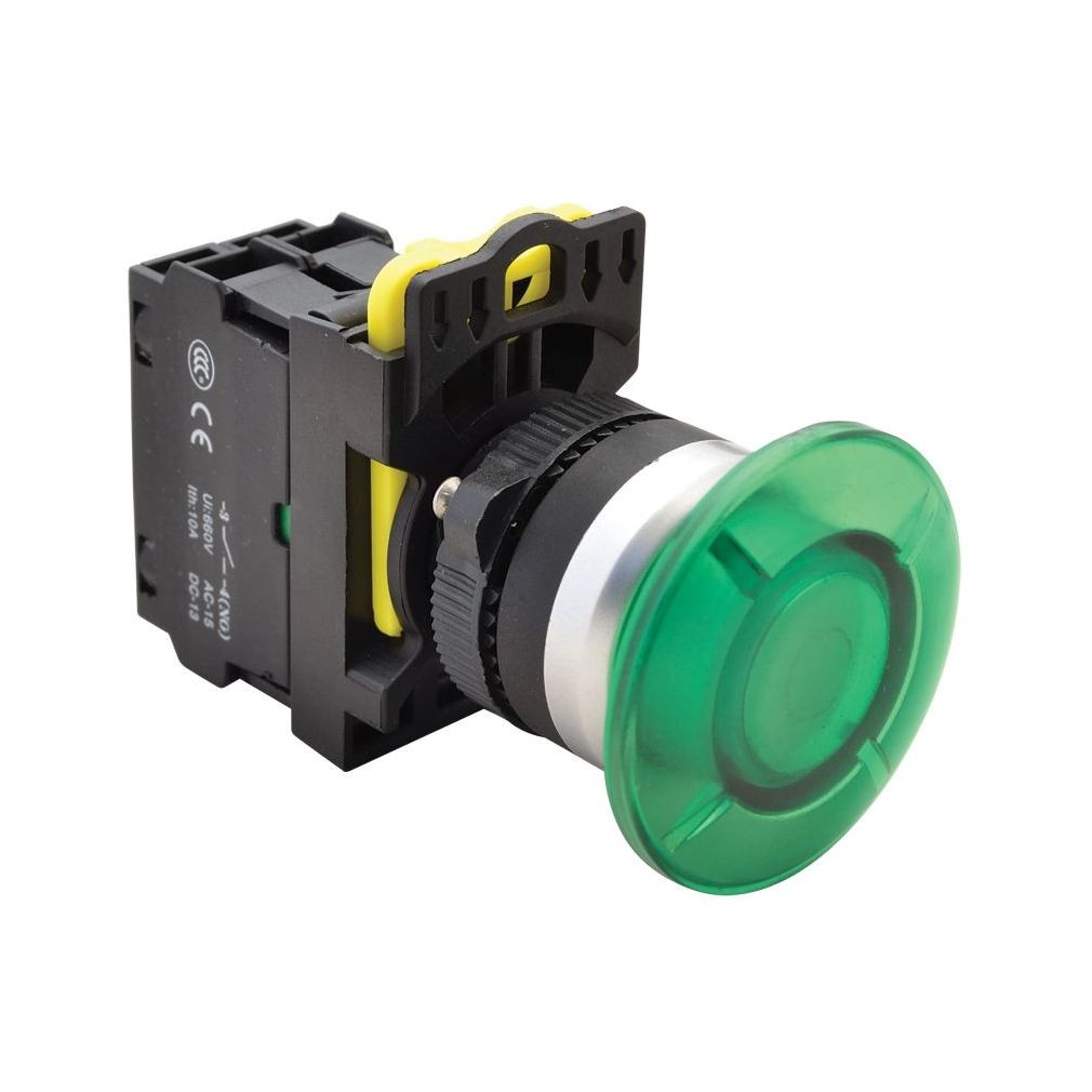 Gombafejű világító nyomógomb,zöld 1×NO, 5A, 40mm, NYG3-MLG Tracon