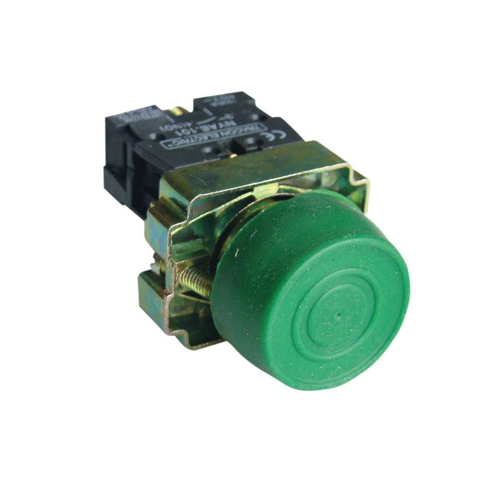 Gumiburkolatos nyomógomb, fémalapra szerelt, zöld 1×NO, 3A/240V AC, IP42, d=22mm NYGBP31Z Tracon