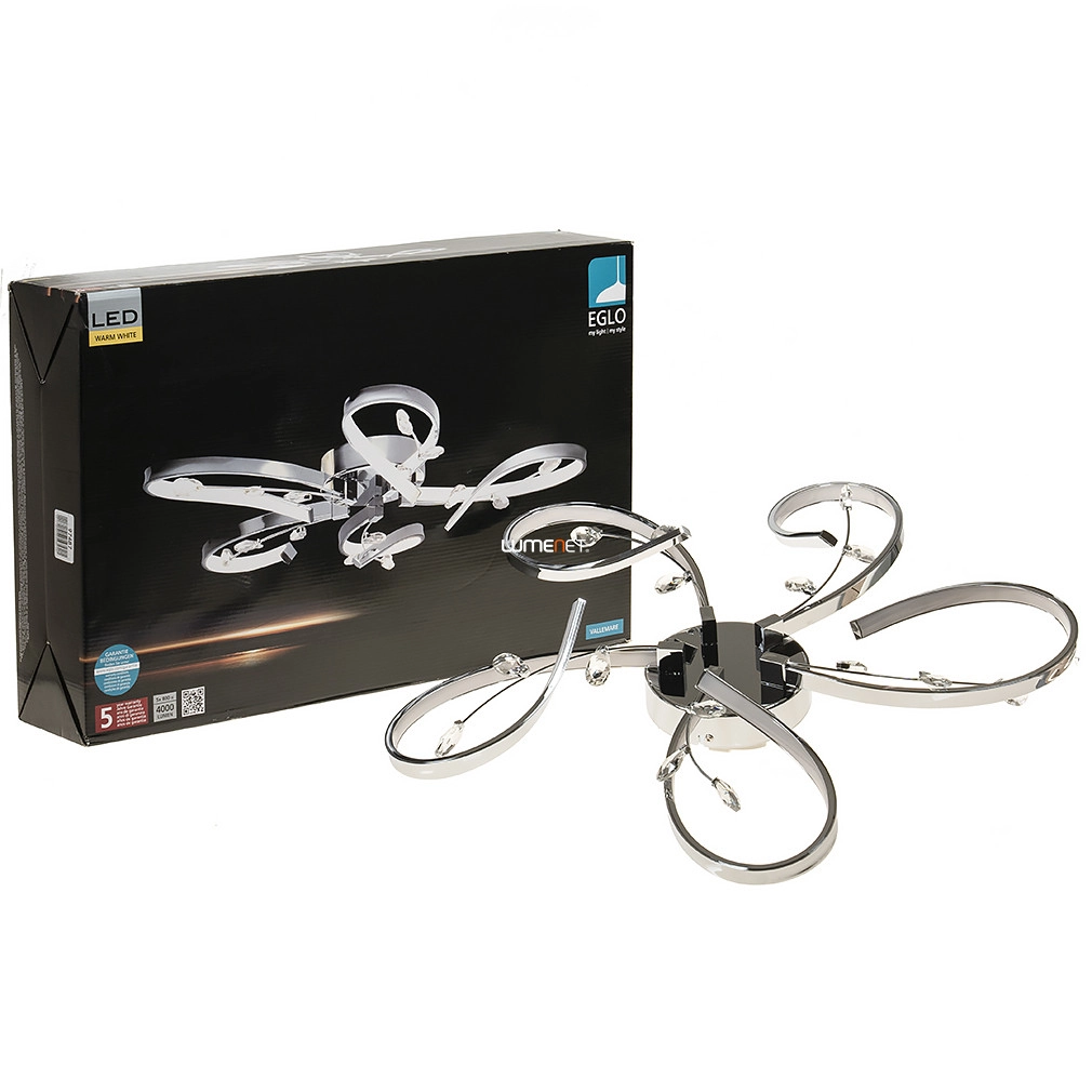 A Vallemare Eglo 97487 hajlított mennyezeti LED lámpa kristály díszekkel modern formatervezésű, prémium minőségű világítási megoldás. A lámpatest 33 W teljesítményű, integrált LED modullal működik, amely 4500 lumen fényáramot biztosít melegfehér, 3000 Kelvin színhőmérséklet mellett. A termék acélból és műanyagból készült, króm és fehér színkombinációban, amelyet kristály díszítés egészít ki. Az IP20 védettségi szint beltéri használatra teszi alkalmassá. A mennyezeti lámpa átmérője 650 mm, magassága 125 mm, tömege 2,1 kg. A termék logisztikai kódja 97487, gyártója az EGLO.