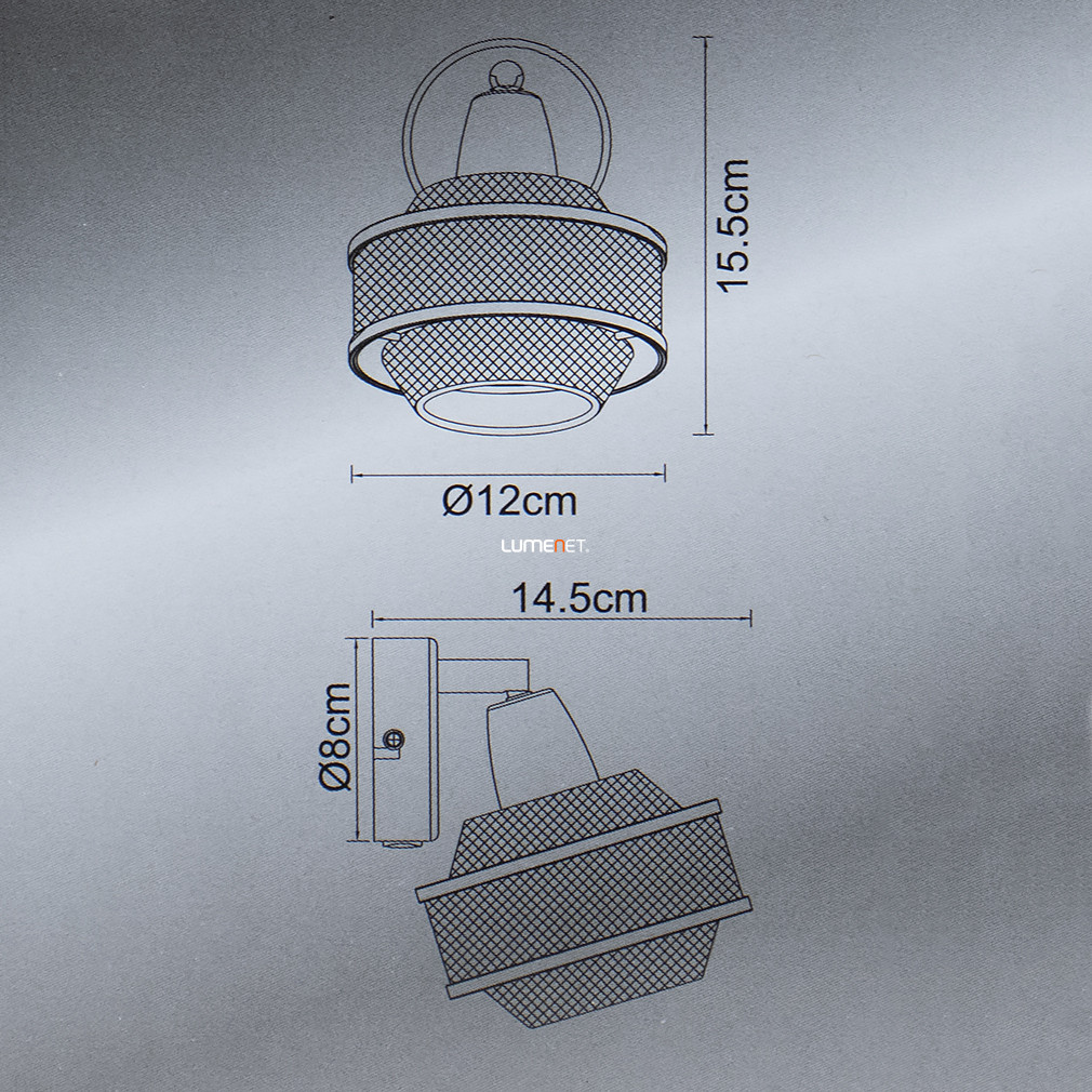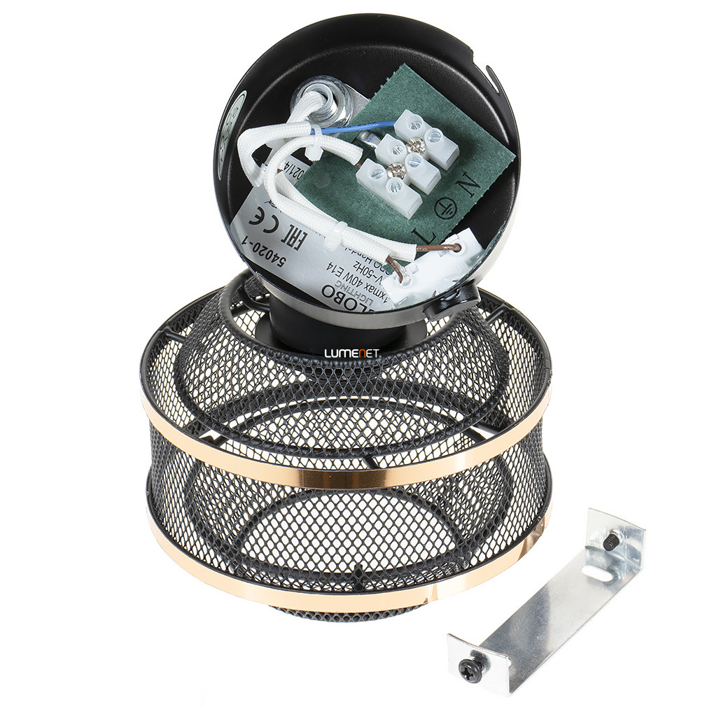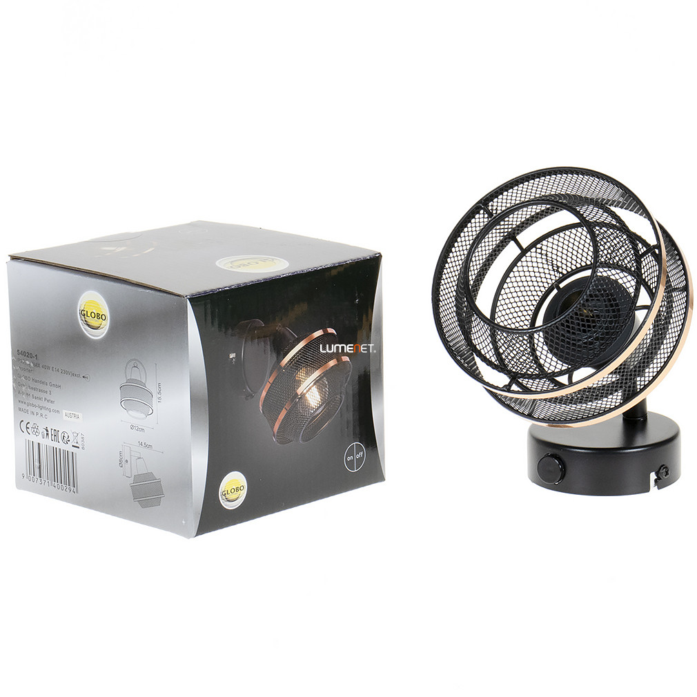 A Bellona Globo 54020-1 hálós spot lámpa modern, fekete-arany színű fém kivitelben készül, amely egy darab E14 foglalattal rendelkezik. A lámpatest 145 mm hosszú, 120 mm széles és 155 mm magas, tömege 0,41 kg. Fényforrást nem tartalmaz, de cserélhető fényforrással működtethető, így a fényáram, színhőmérséklet és teljesítmény szabadon választható az E14 foglalatnak megfelelően. A lámpa IP20 védettséggel rendelkezik, így beltéri használatra alkalmas. Kapcsolóval szerelt, szabályozható funkcióval nem rendelkezik. A termék csomagolási méretei: 13 cm x 13 cm x 12 cm. A gyártó a Globo.