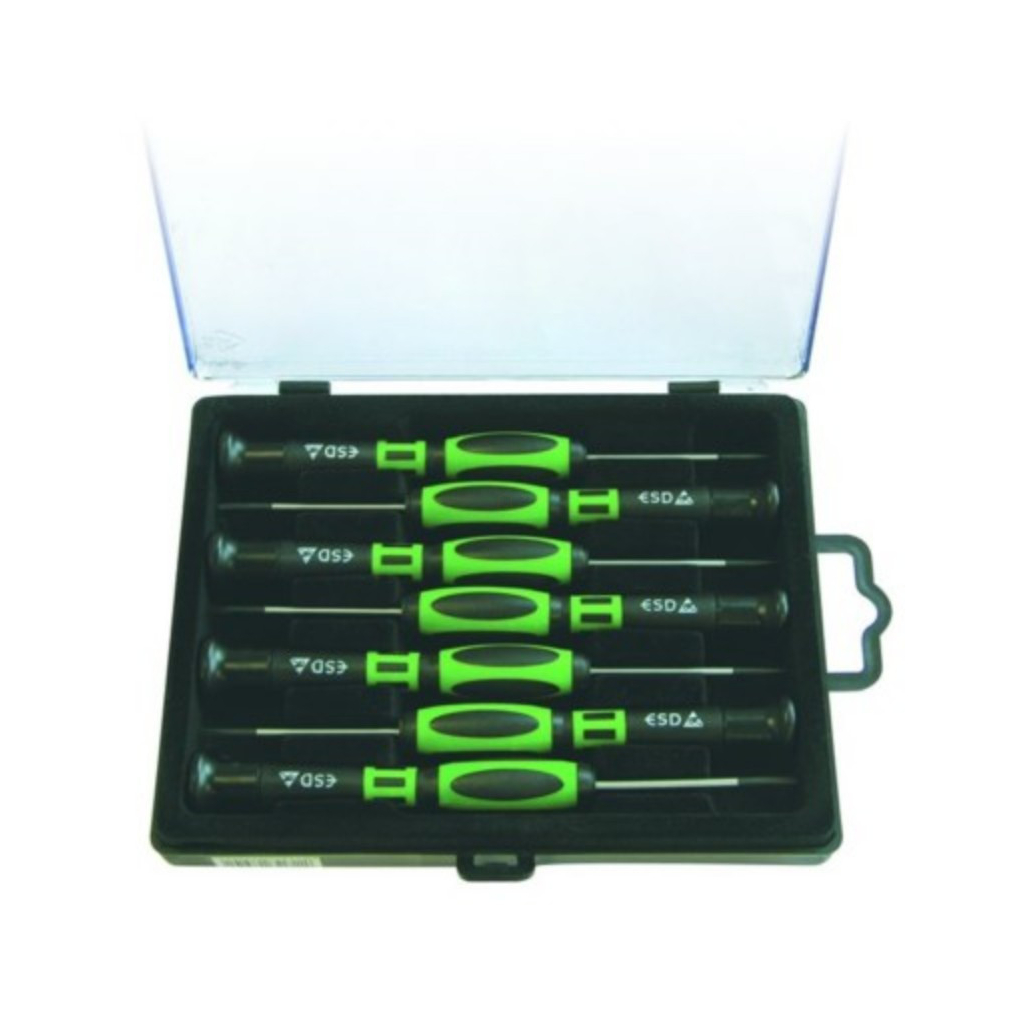 Méretenként 1 db. ESD-elektronikai műszerész csavarhúzó 1,6 x 50, 2,0 x 50, 2,4 x 50, 3,0 x 50 és méretenként 1 db. Phillips 1, 0 és 00 x 50