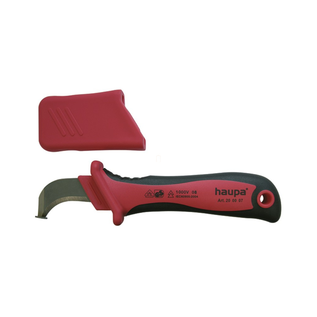 Kampóformájú késsel nedvesség álló kábelek külső köpenyének felhasításához és csupaszításához, markolata szívós, ütésálló műanyag, pengevédővel.