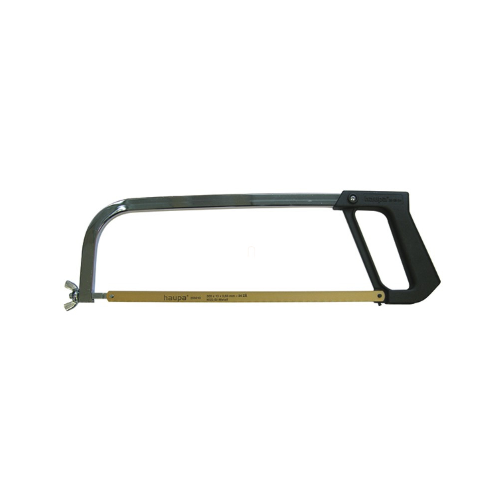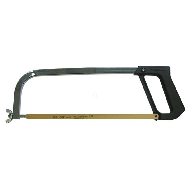 \nFém fűrészkeretLapított ovális acélcsőből, fényesen krómozott, acél feszítő stiftek, HSS-BI-metál fűrészlappal, „A” forma