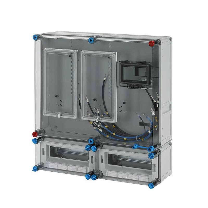 Hensel BASIC HB33KF24A-E Eon területre egy- és háromfázisú, két mérőhelyes mérőszekrény mindennapszaki (általános) és előre fizetős mérésre 40A (1F), ill. 80A (3F), valamint egyfázisú vezérelt és vezérelt előre fizetős mérésre 40A (1F), ill. 63A (3F), fogyasztói kiselosztóval